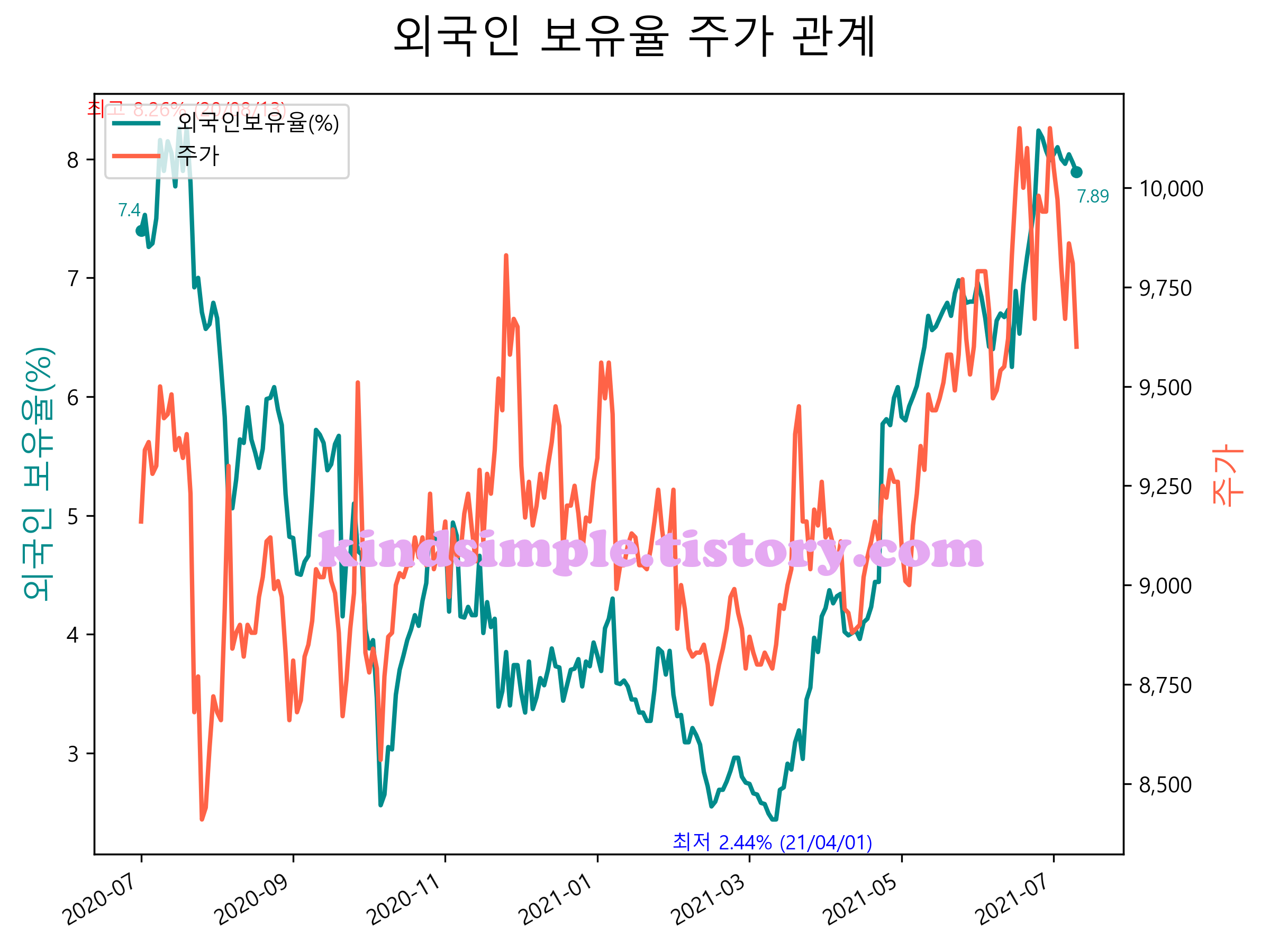 최근 1년간 외국인 보유율 및 주가와의 관계입니다.
