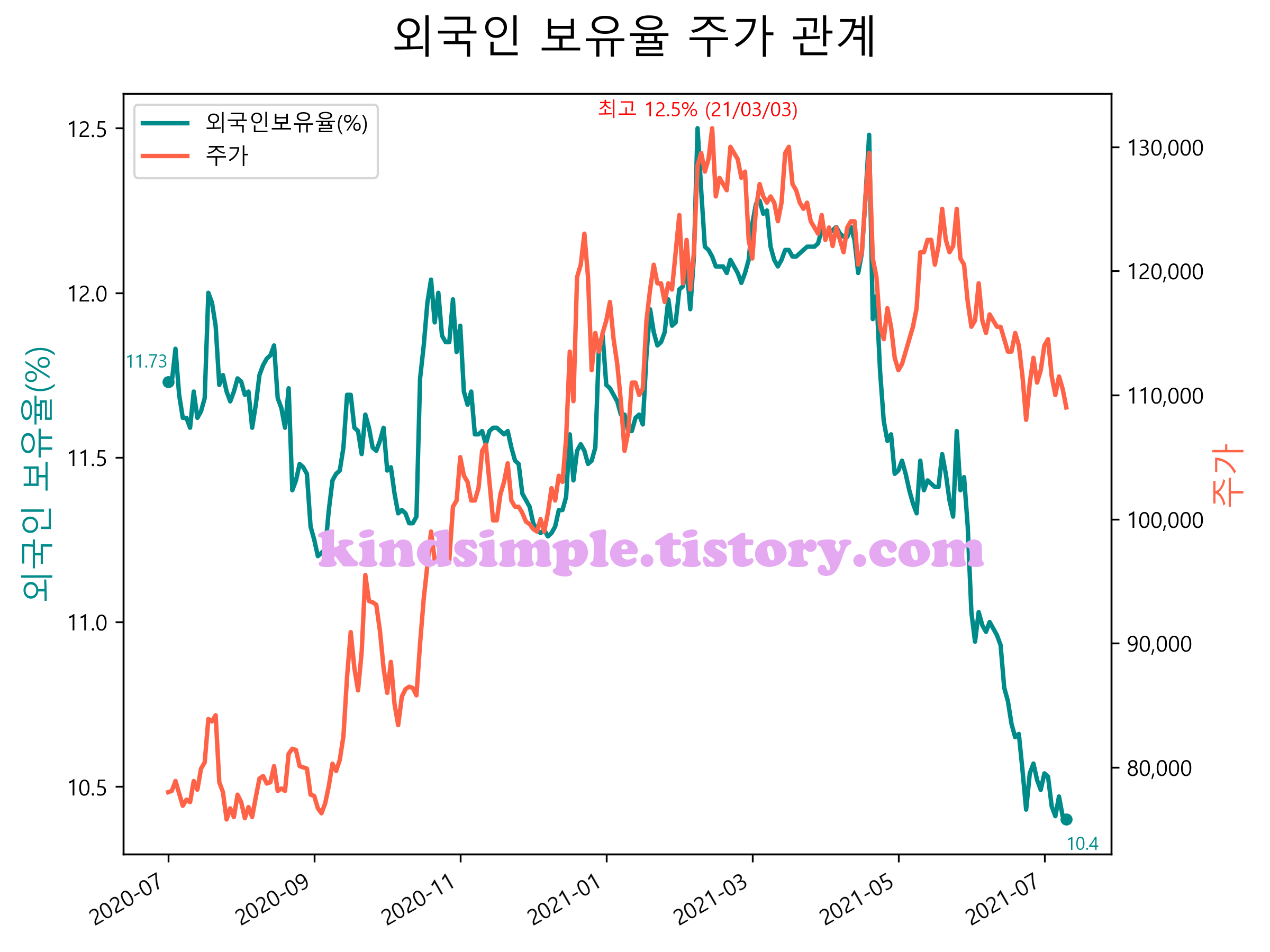 최근 1년간 외국인 보유율 및 주가와의 관계입니다.
