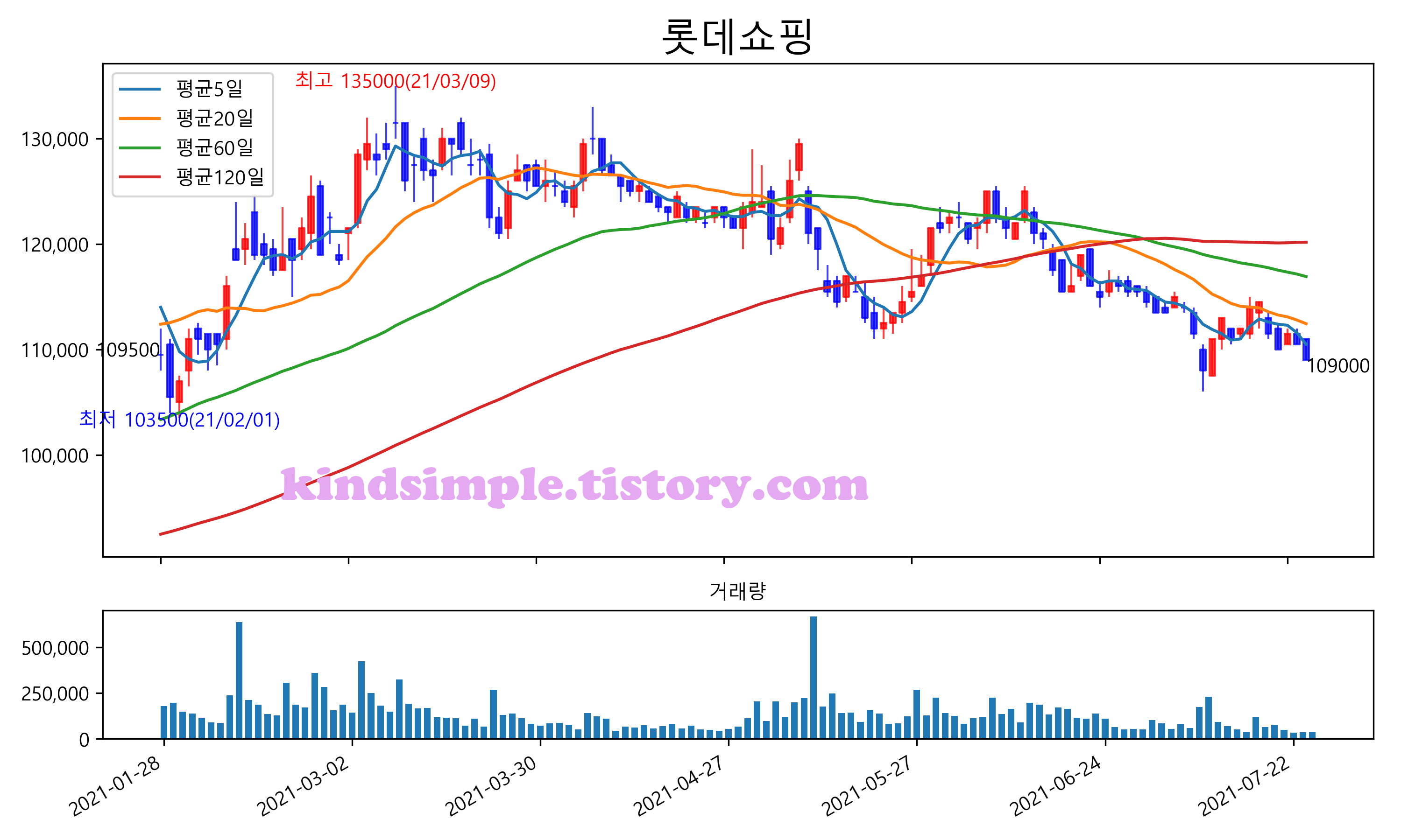 최근 6개월간 캔들차트 및 이동평균선입니다.