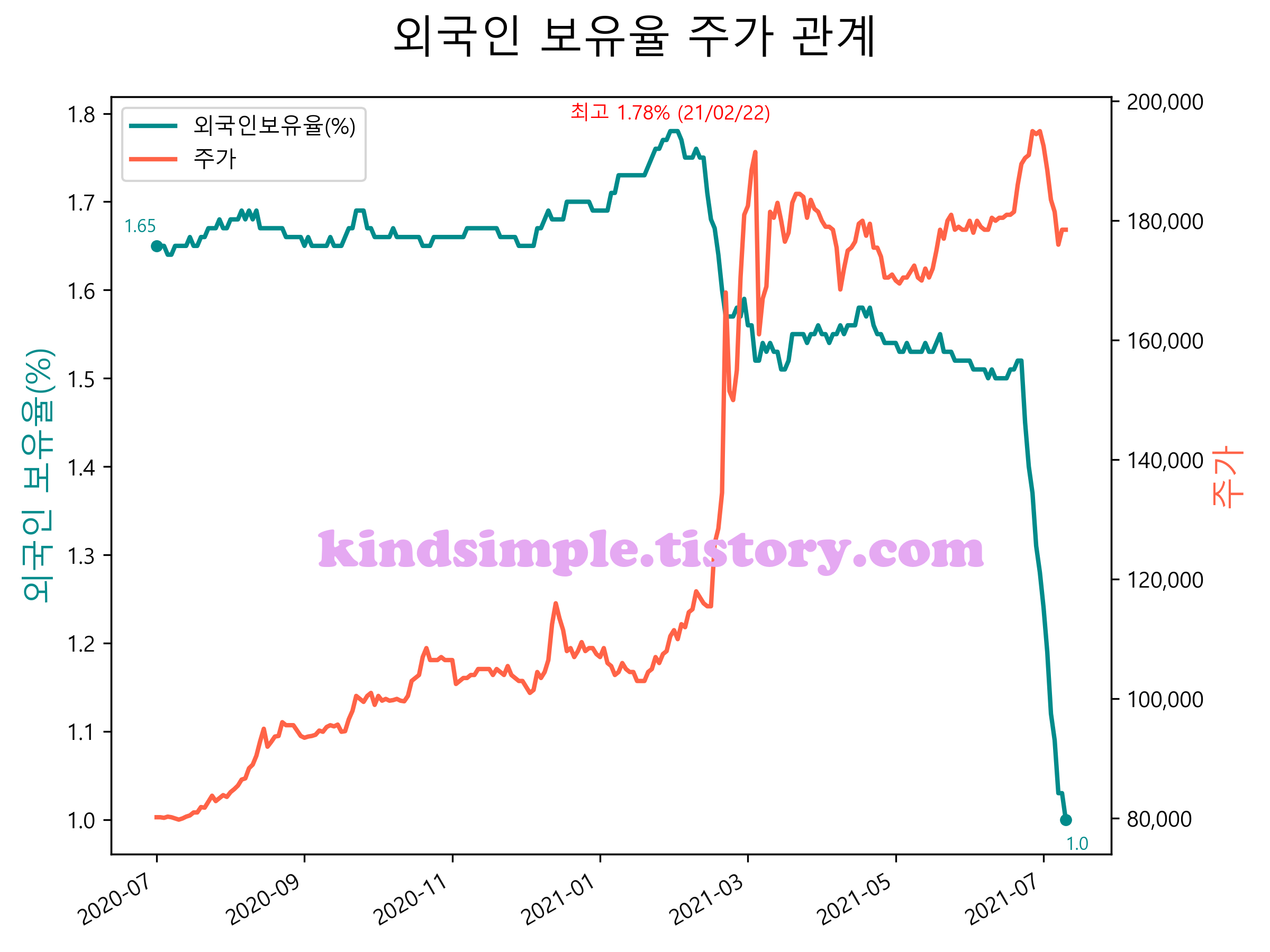 최근 1년간 외국인 보유율 및 주가와의 관계입니다.
