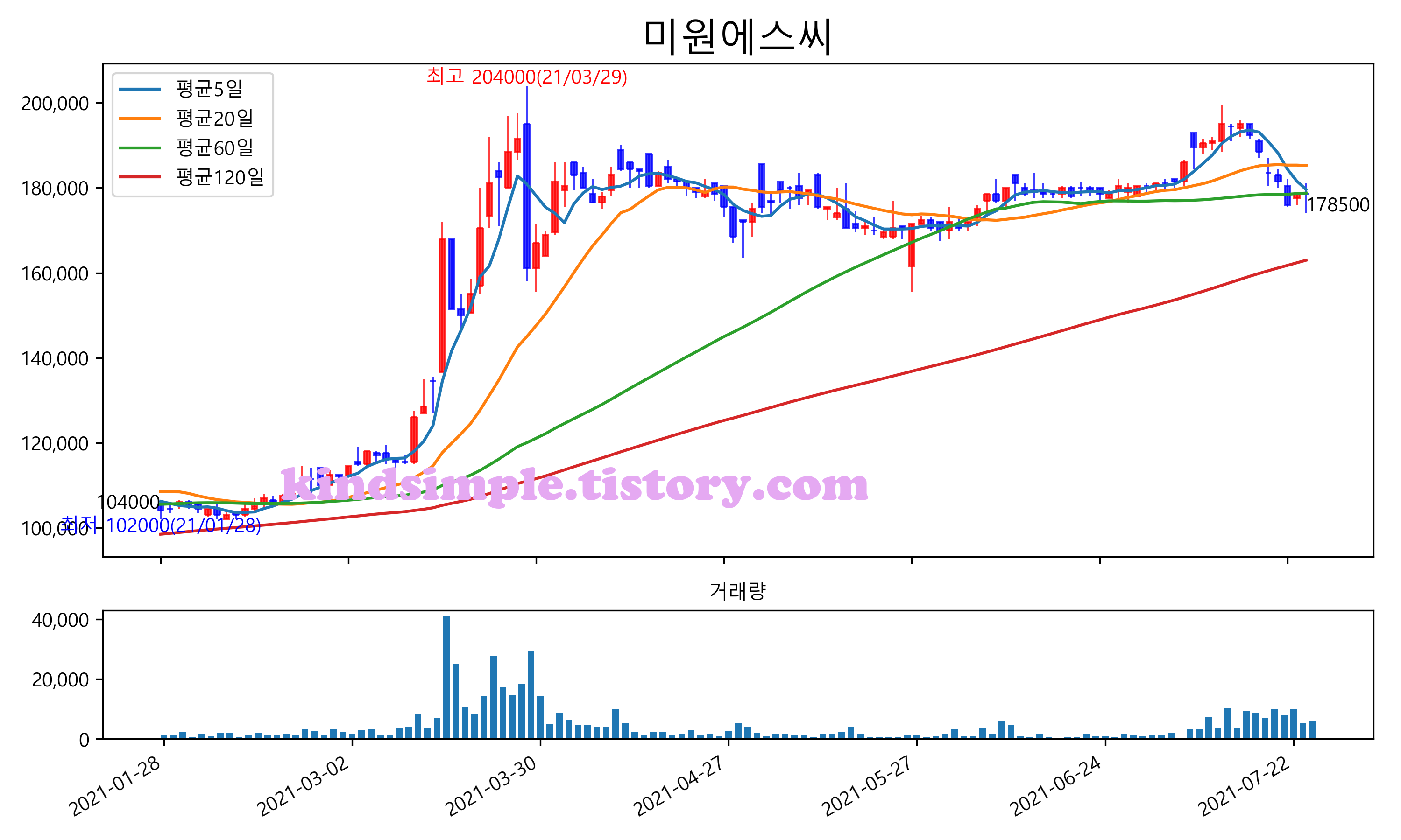 최근 6개월간 캔들차트 및 이동평균선입니다.