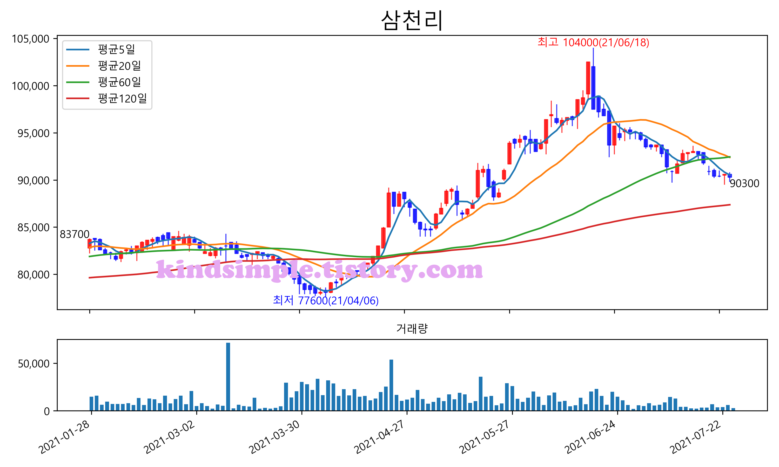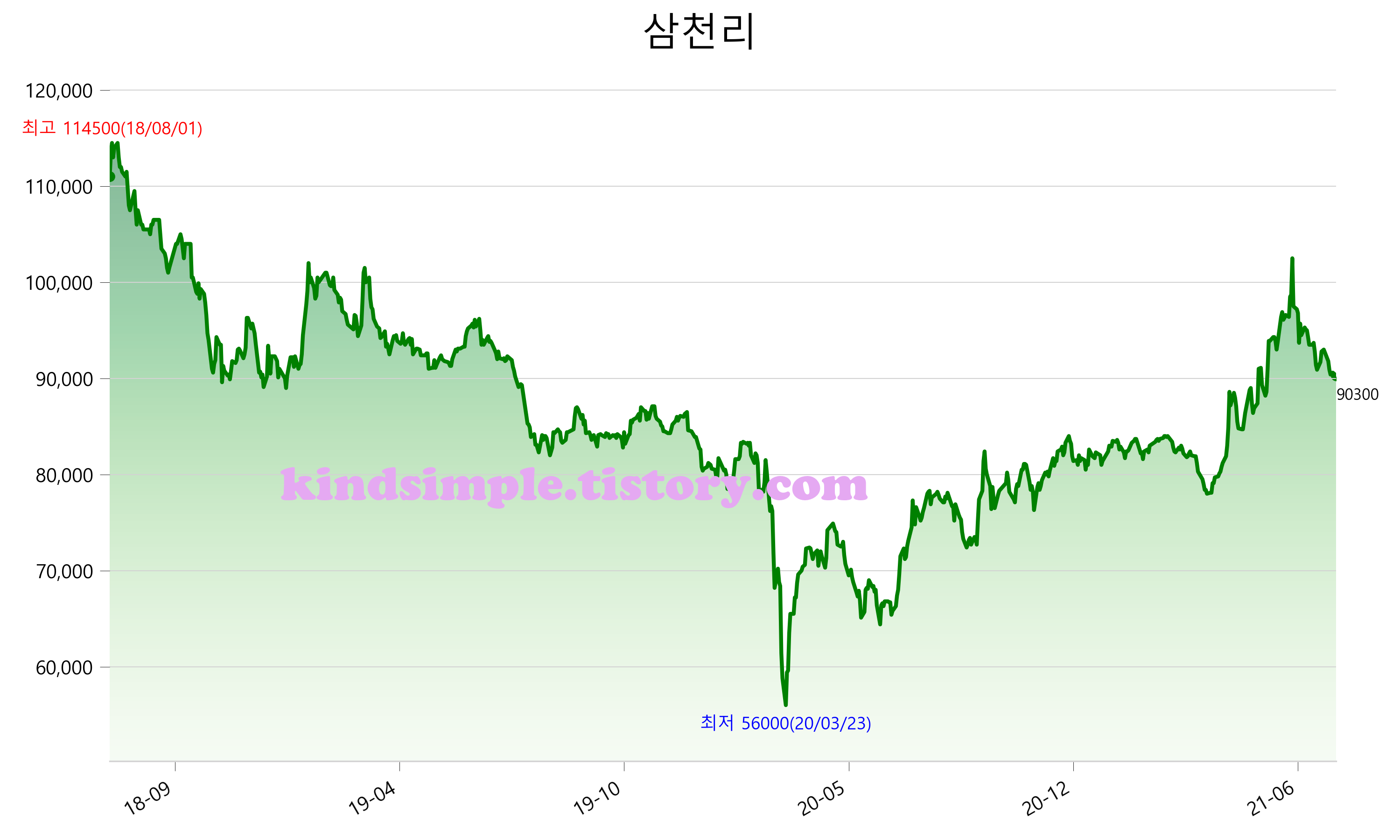 7월 27일 기준 주가는 90,300원 입니다. 아래는 최근 3년간의 주가흐름입니다.