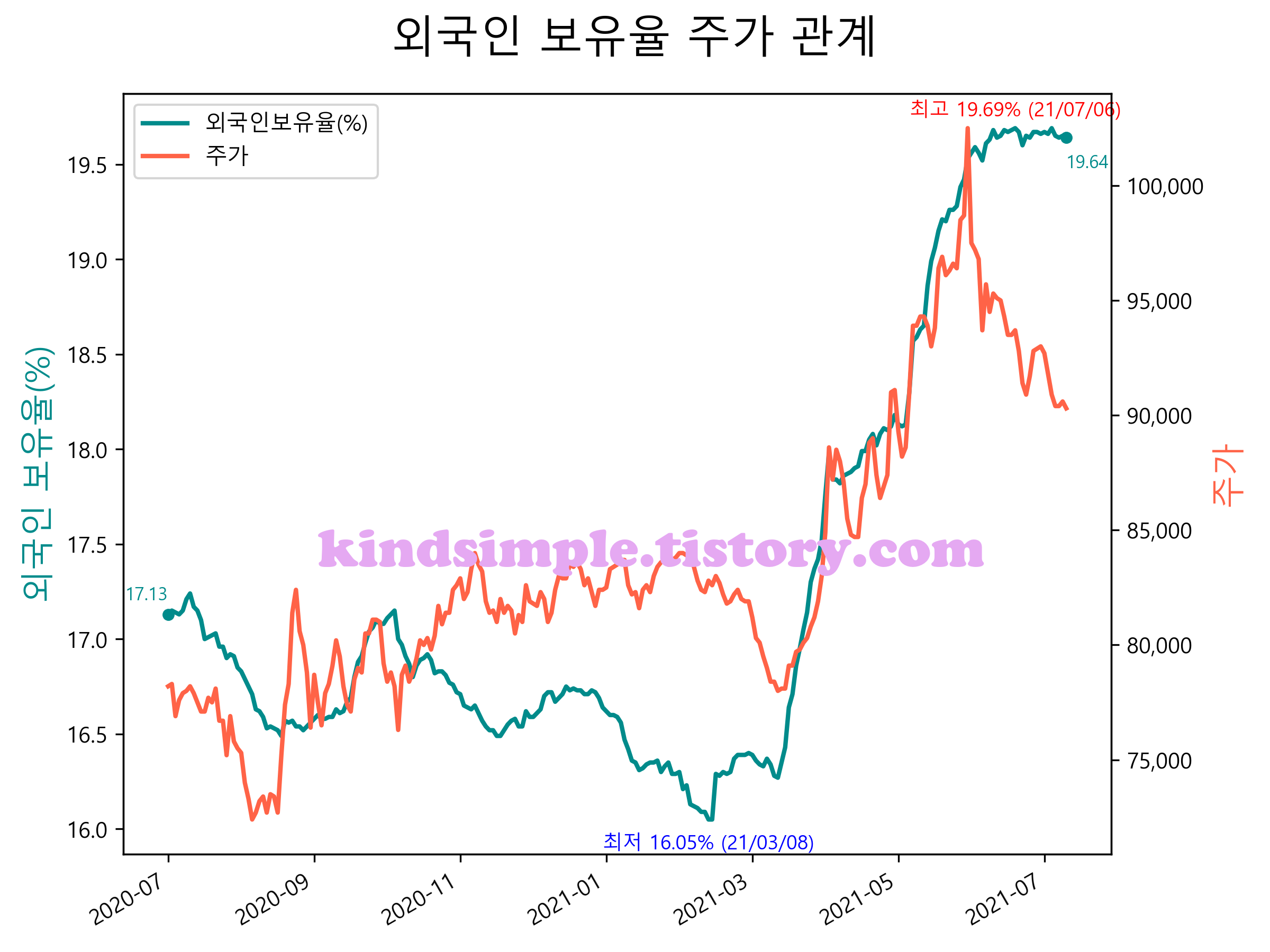 최근 1년간 외국인 보유율 및 주가와의 관계입니다.