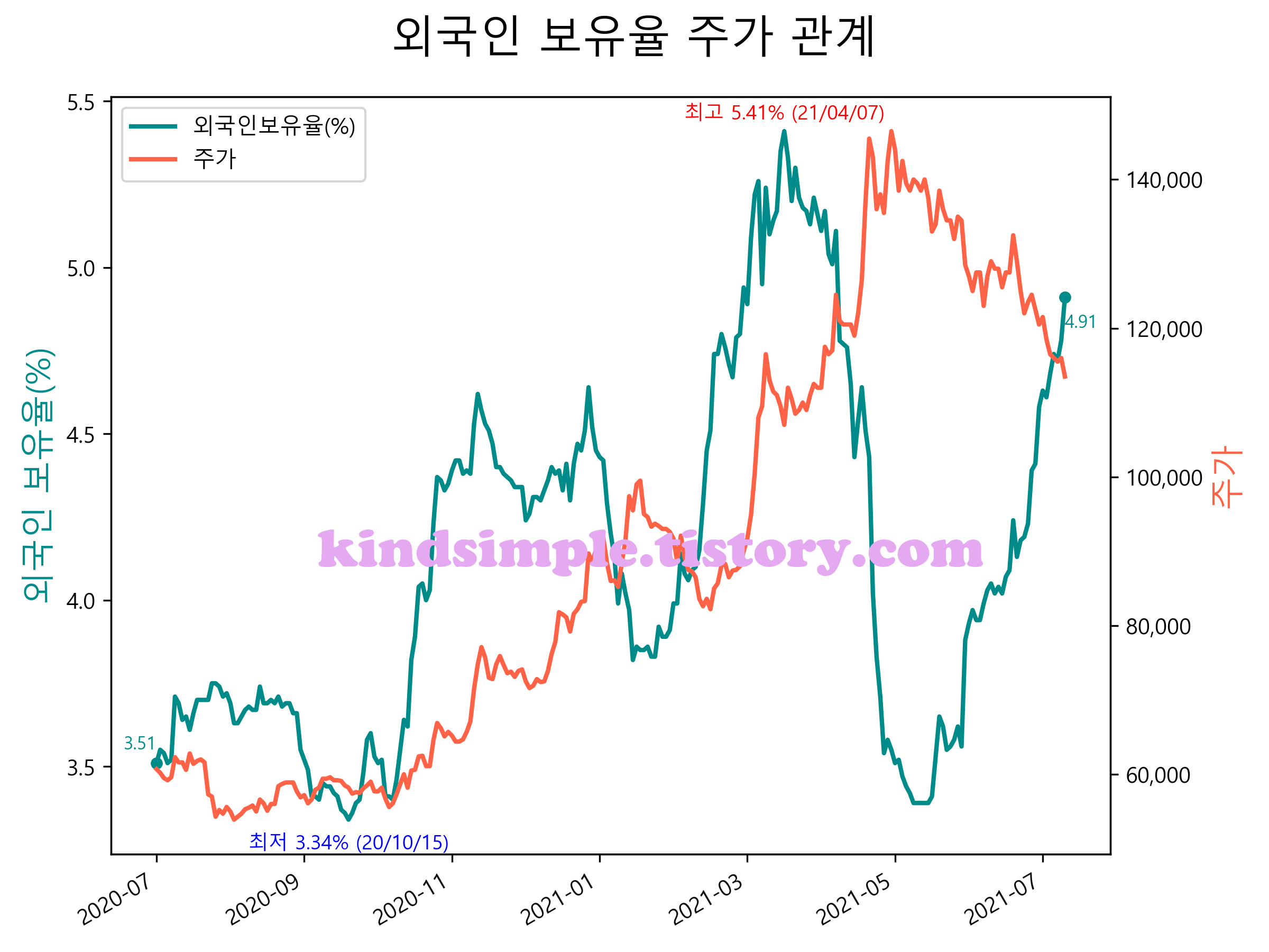 최근 1년간 외국인 보유율 및 주가와의 관계입니다.
