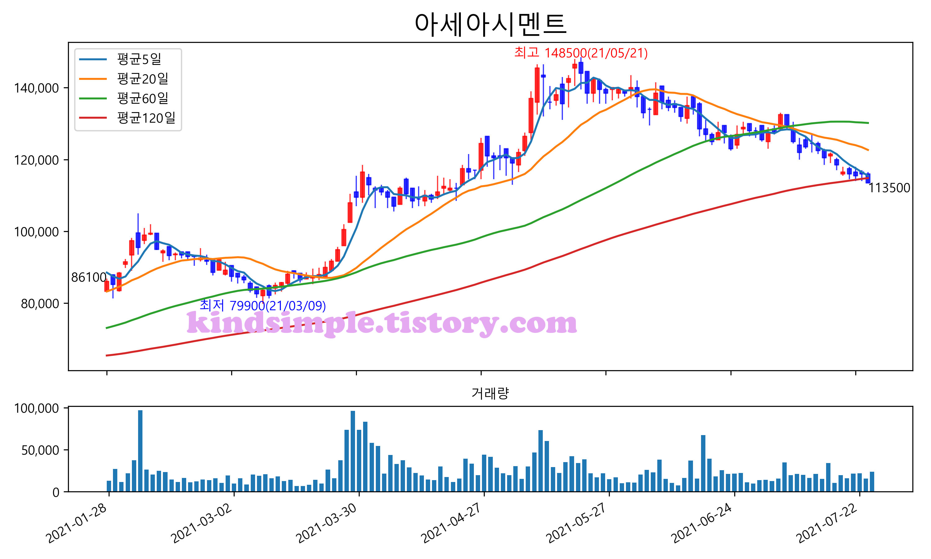 최근 6개월간 캔들차트 및 이동평균선입니다.