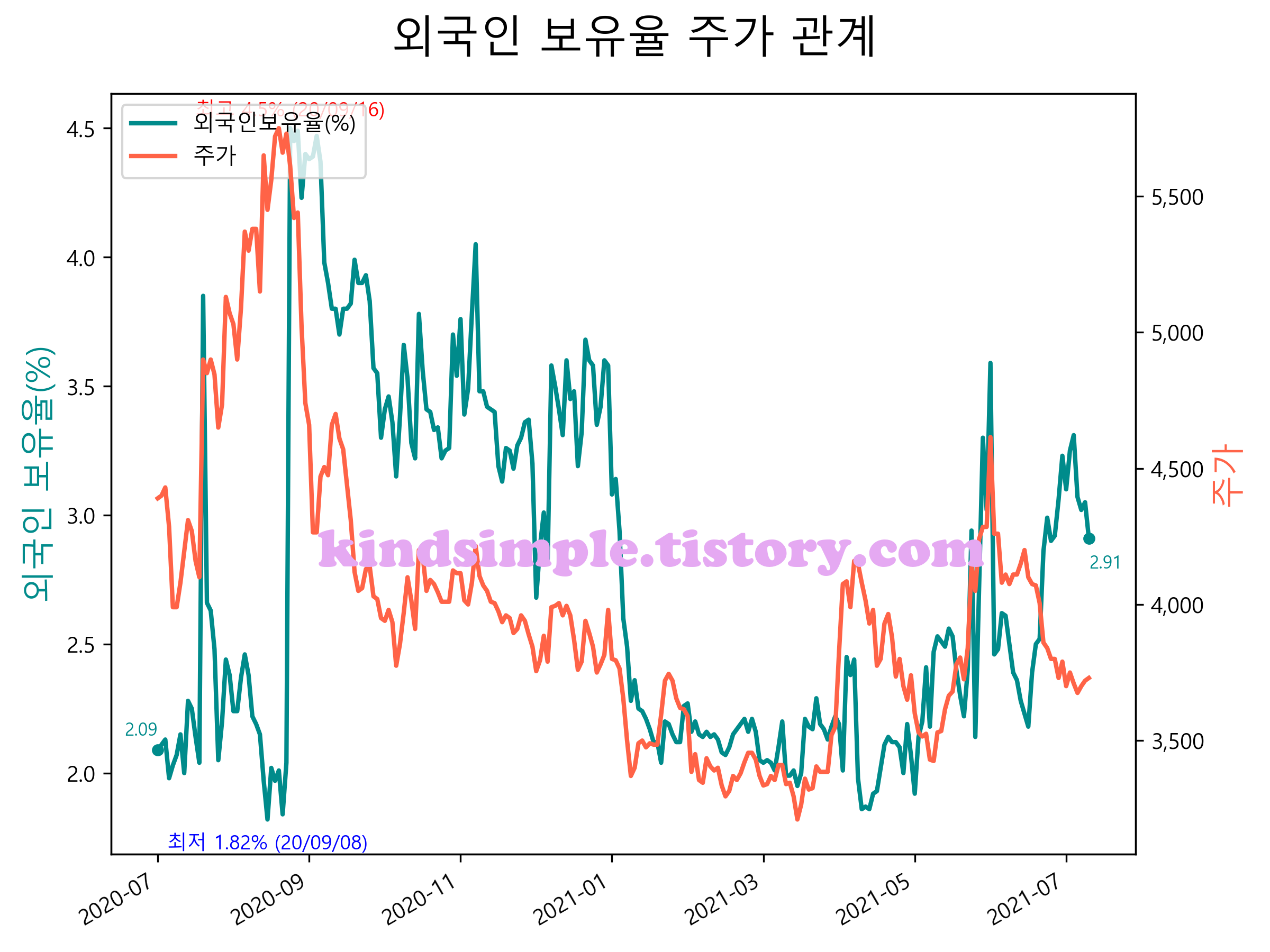 최근 1년간 외국인 보유율 및 주가와의 관계입니다.