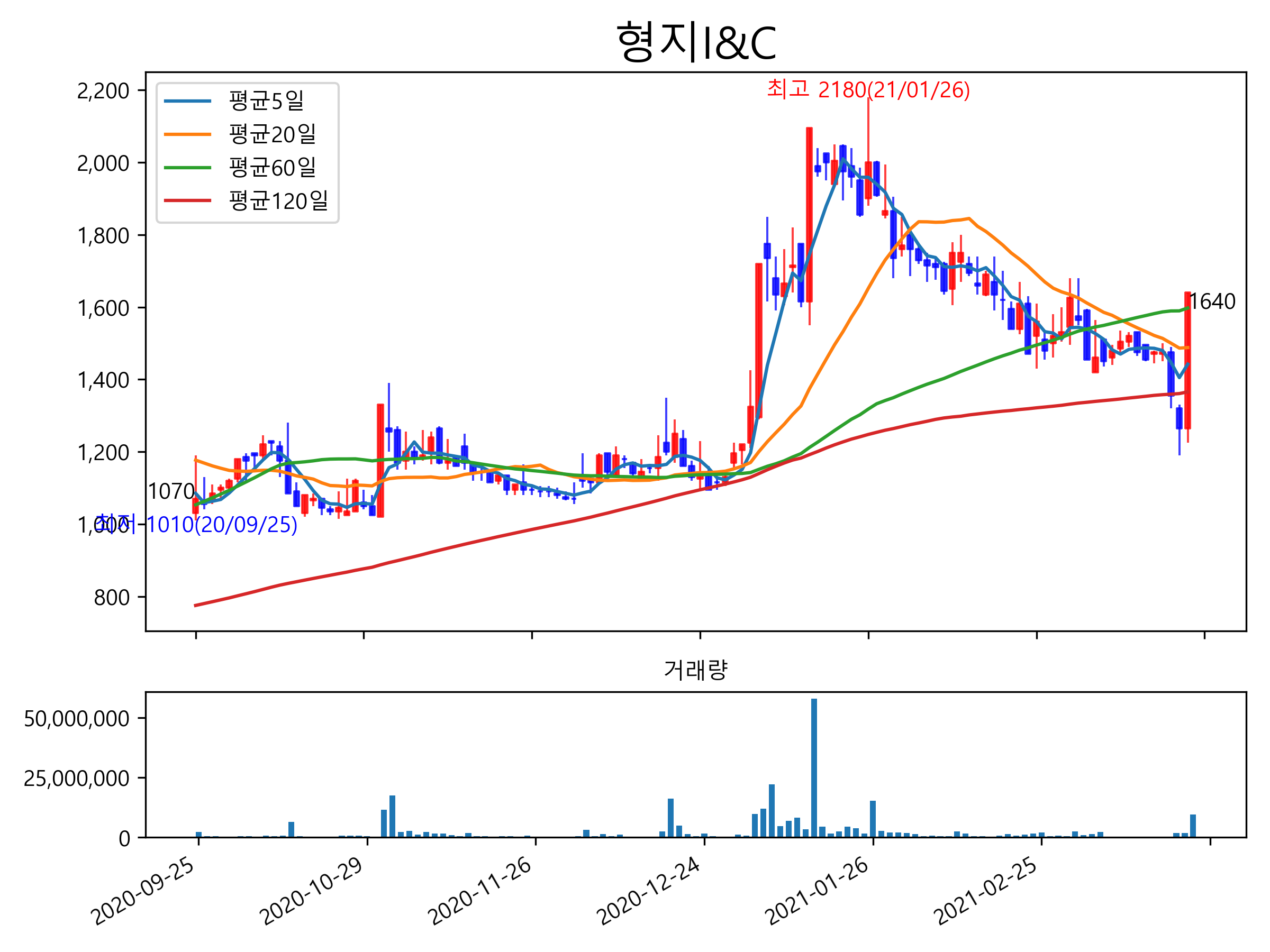 최근 6개월간 캔들차트 및 이동평균선입니다.