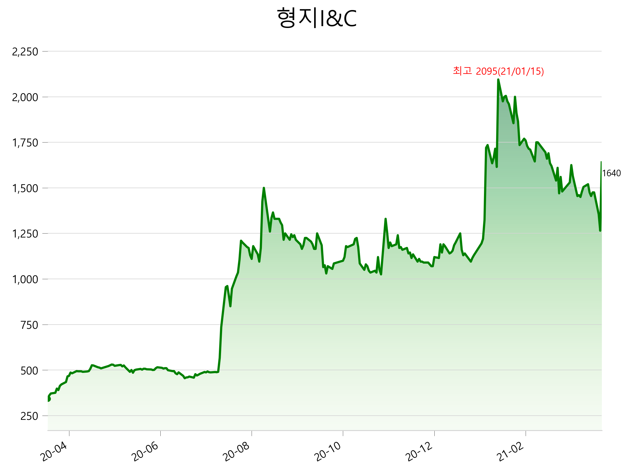 52주 최고가는 2,095원(2021-01-15), 52주 최저가는 343원(2020-03-25)으로 52주간 주가 상승률은 378.1% 입니다.