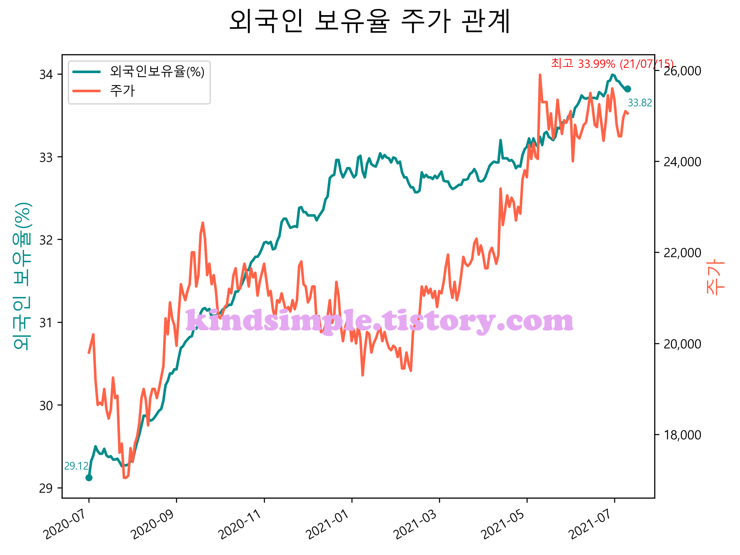 최근 1년간 외국인 보유율 및 주가와의 관계입니다.