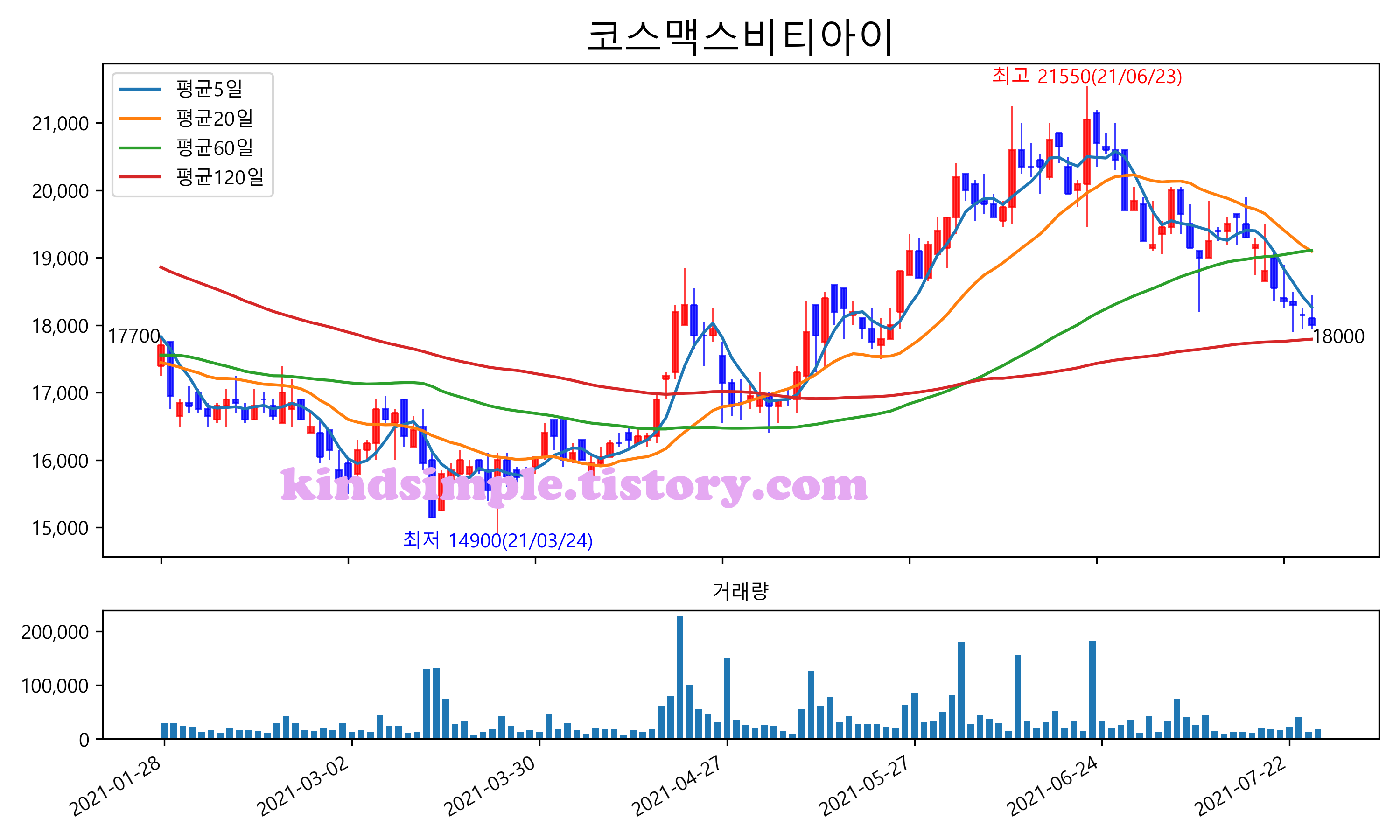 최근 6개월간 캔들차트 및 이동평균선입니다.
