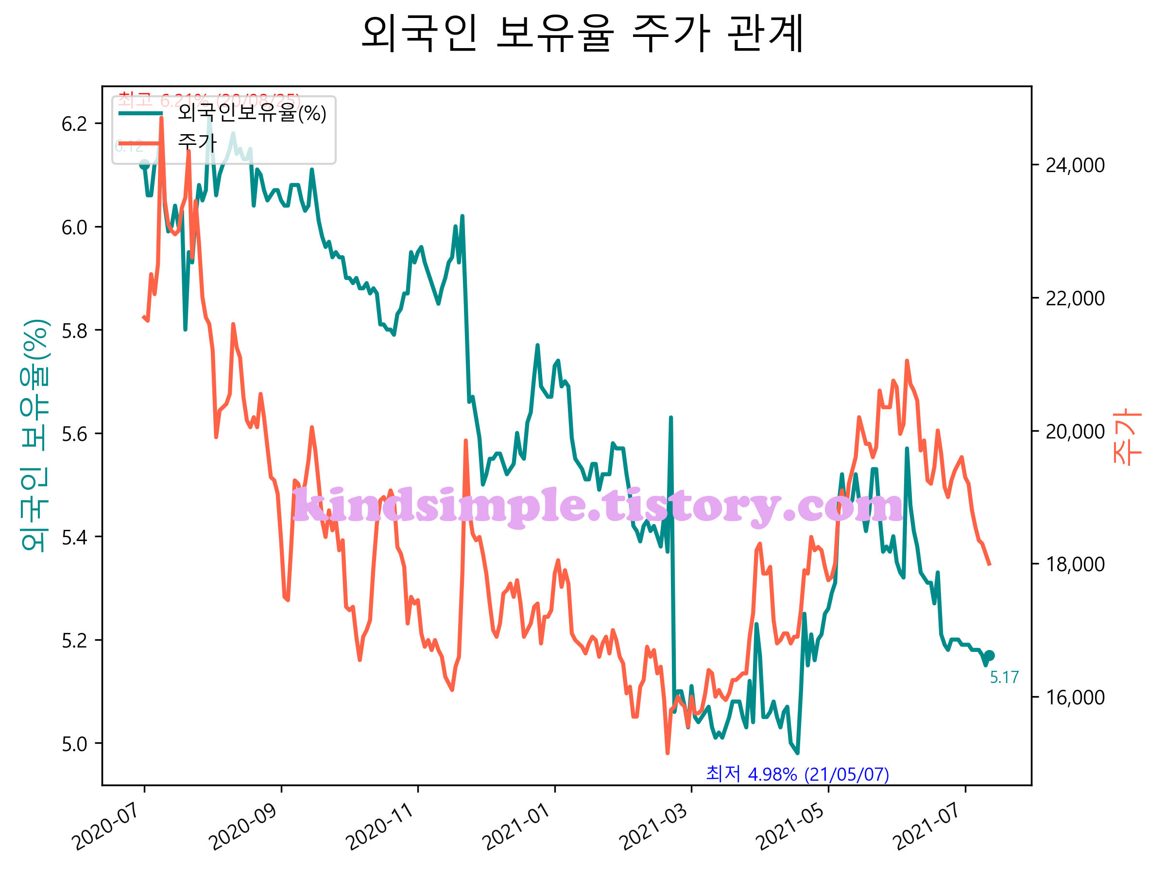 최근 1년간 외국인 보유율 및 주가와의 관계입니다.