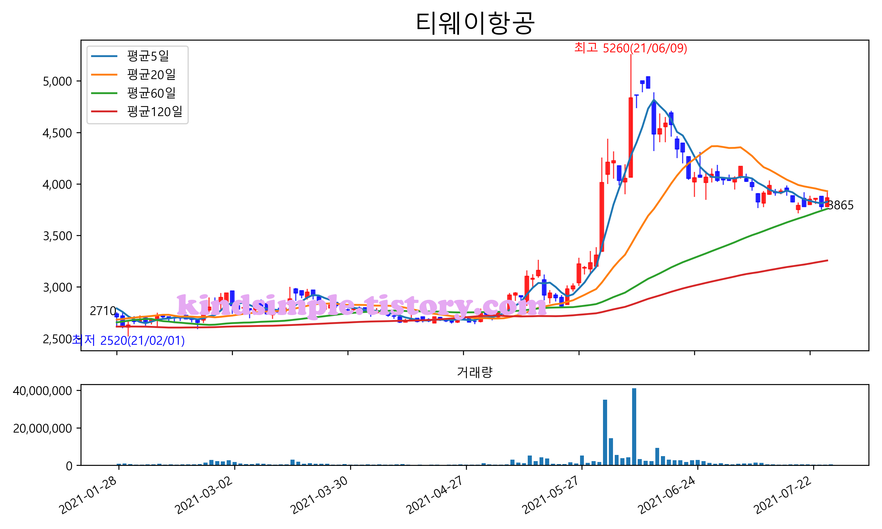 최근 6개월간 캔들차트 및 이동평균선입니다.