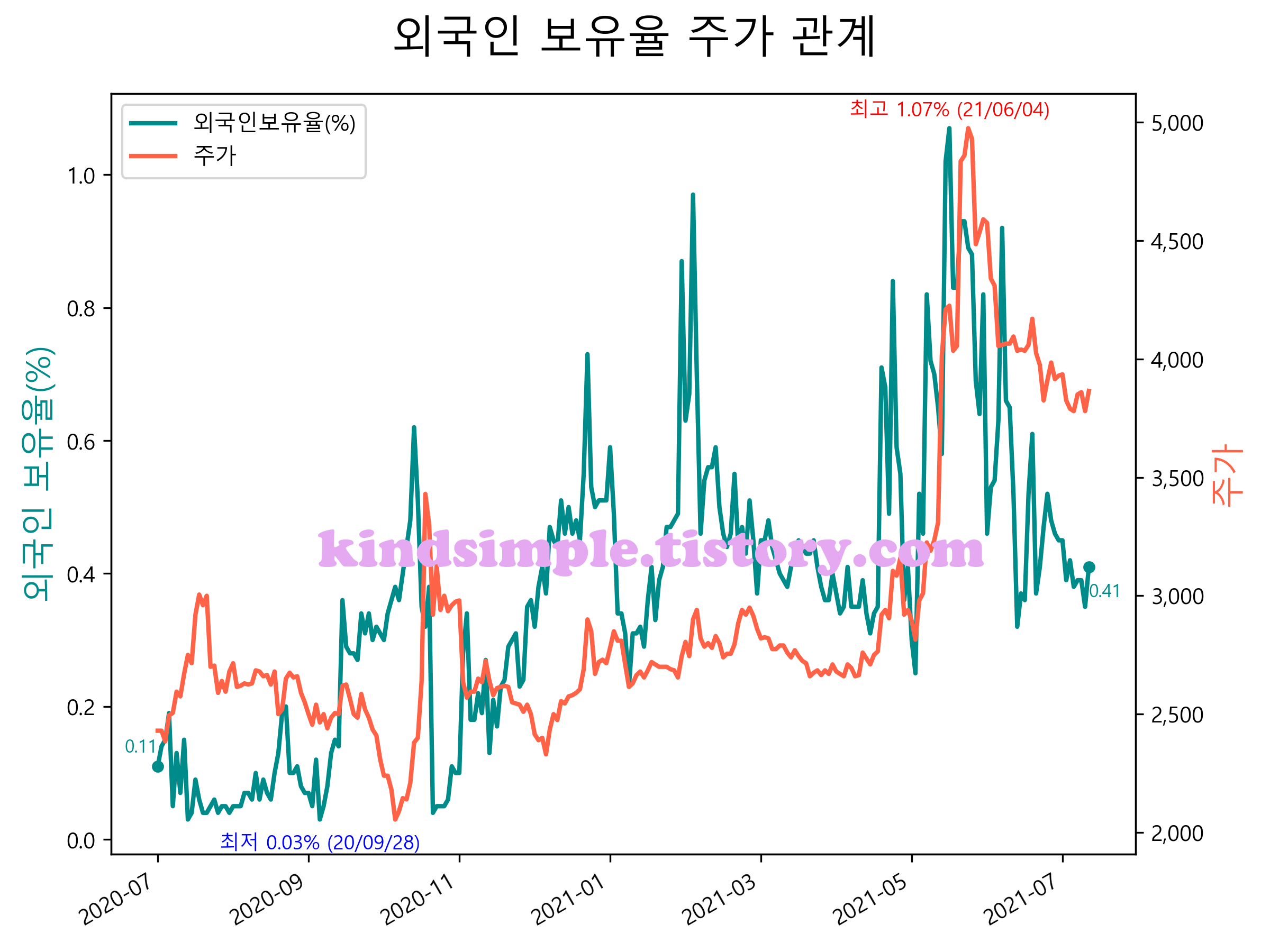 최근 1년간 외국인 보유율 및 주가와의 관계입니다.