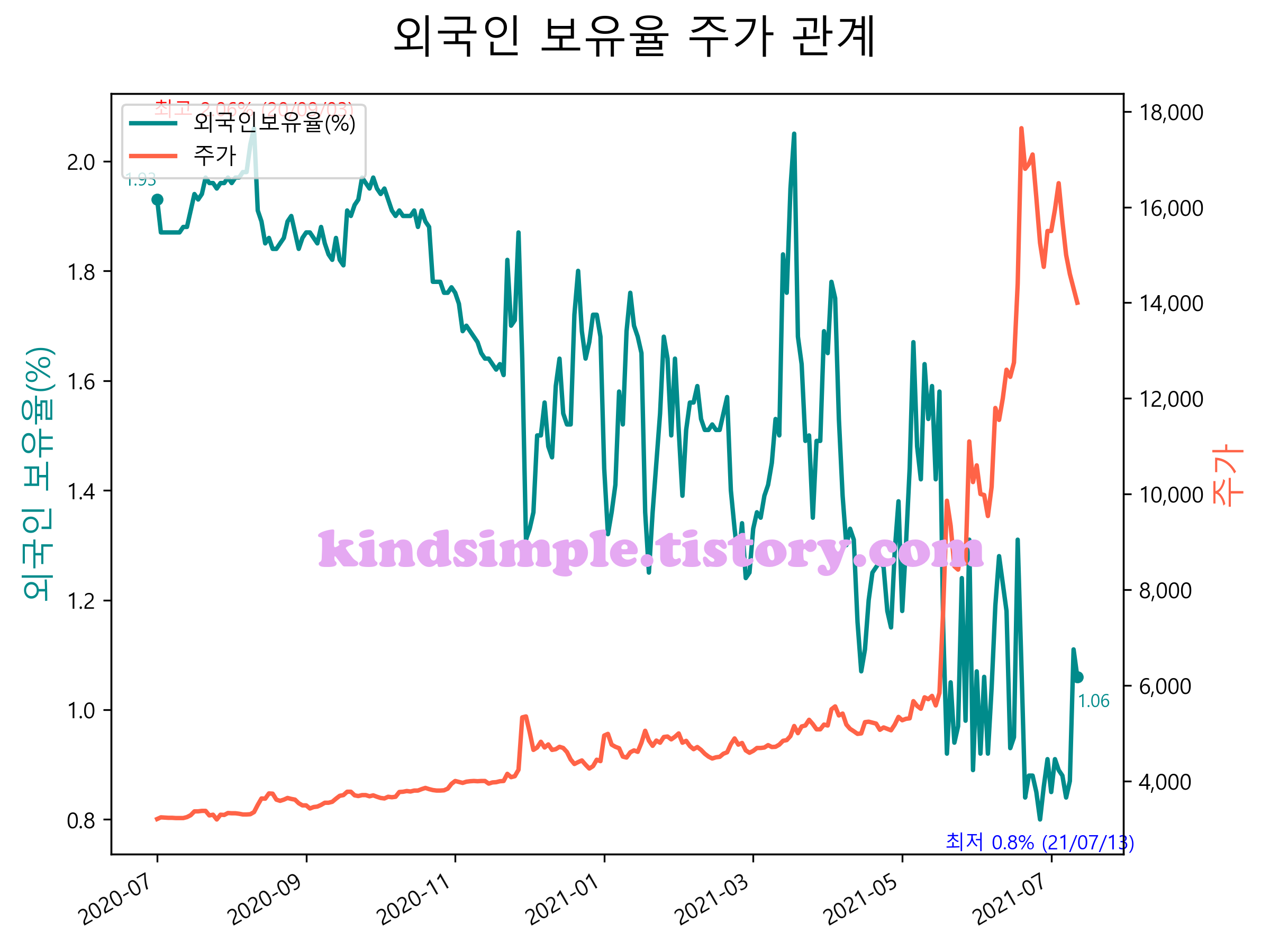 최근 1년간 외국인 보유율 및 주가와의 관계입니다.