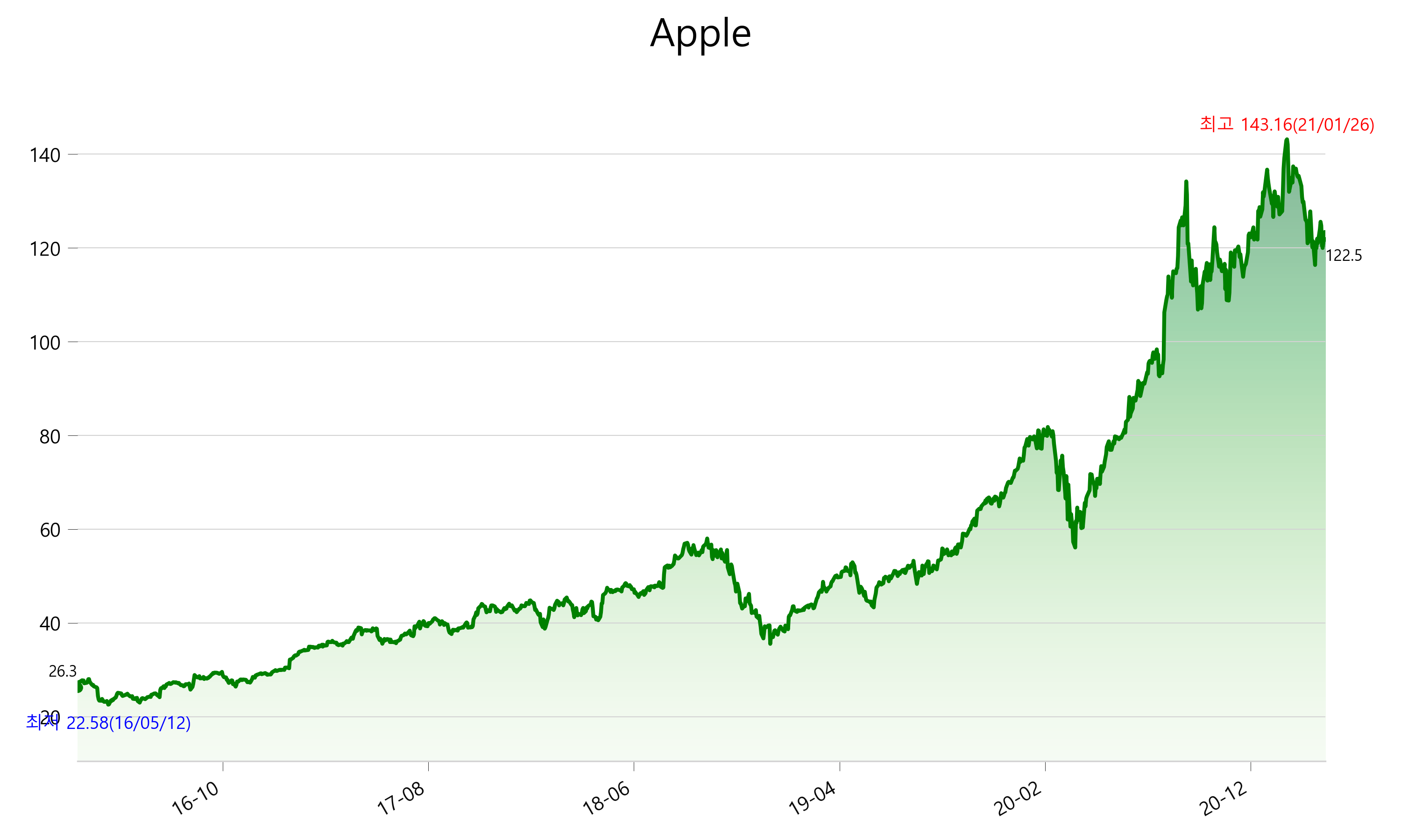 3월 24일 기준 주가는 122.5달러 입니다. 5년전과 비교해서 366.0% 상승했습니다.