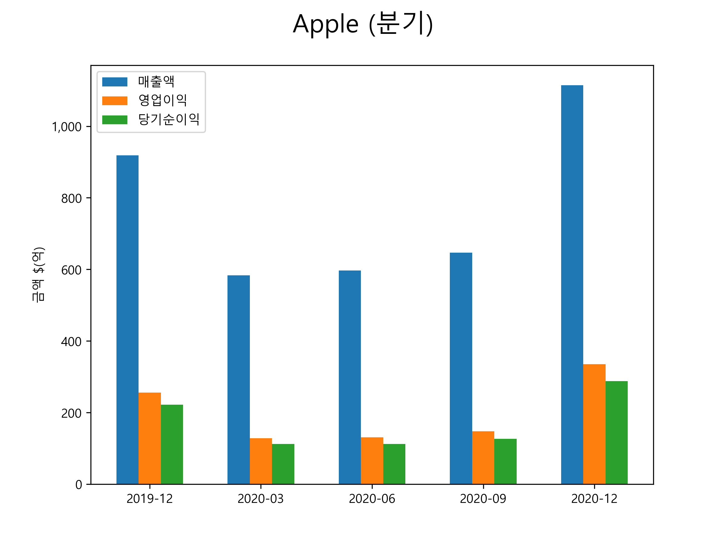 애플의 2020년 4분기 매출은 1114.4억달러, 영업이익 335.3억달러, 당기순이익 287.6억달러을 기록했습니다. 분기별 매출 및 영업이익, 당기순이익 표입니다.