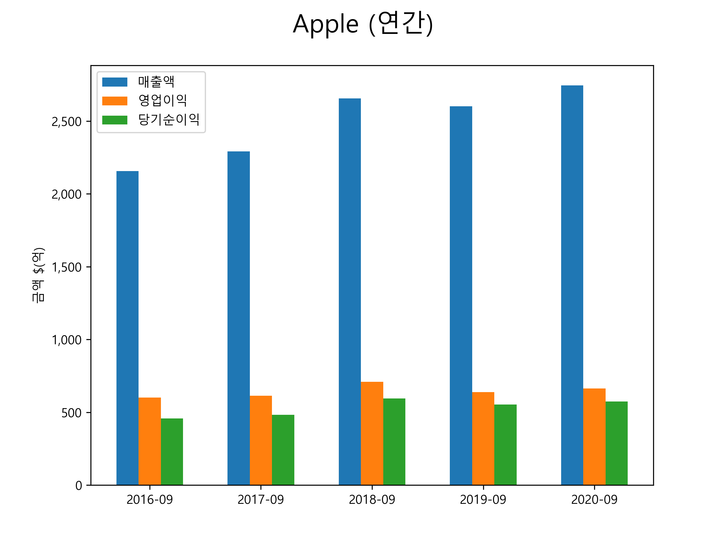 애플의 2020년 매출은 2745.2억달러, 영업이익 662.9억달러, 당기순이익 574.1억달러을 기록했습니다. 연간별 매출 및 영업이익, 당기순이익 표입니다.