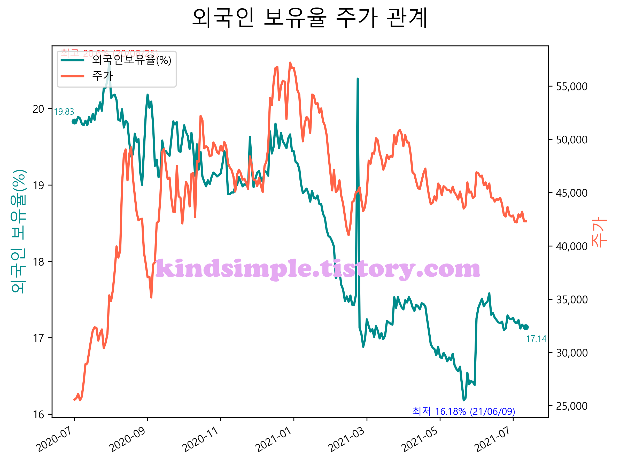 최근 1년간 외국인 보유율 및 주가와의 관계입니다.