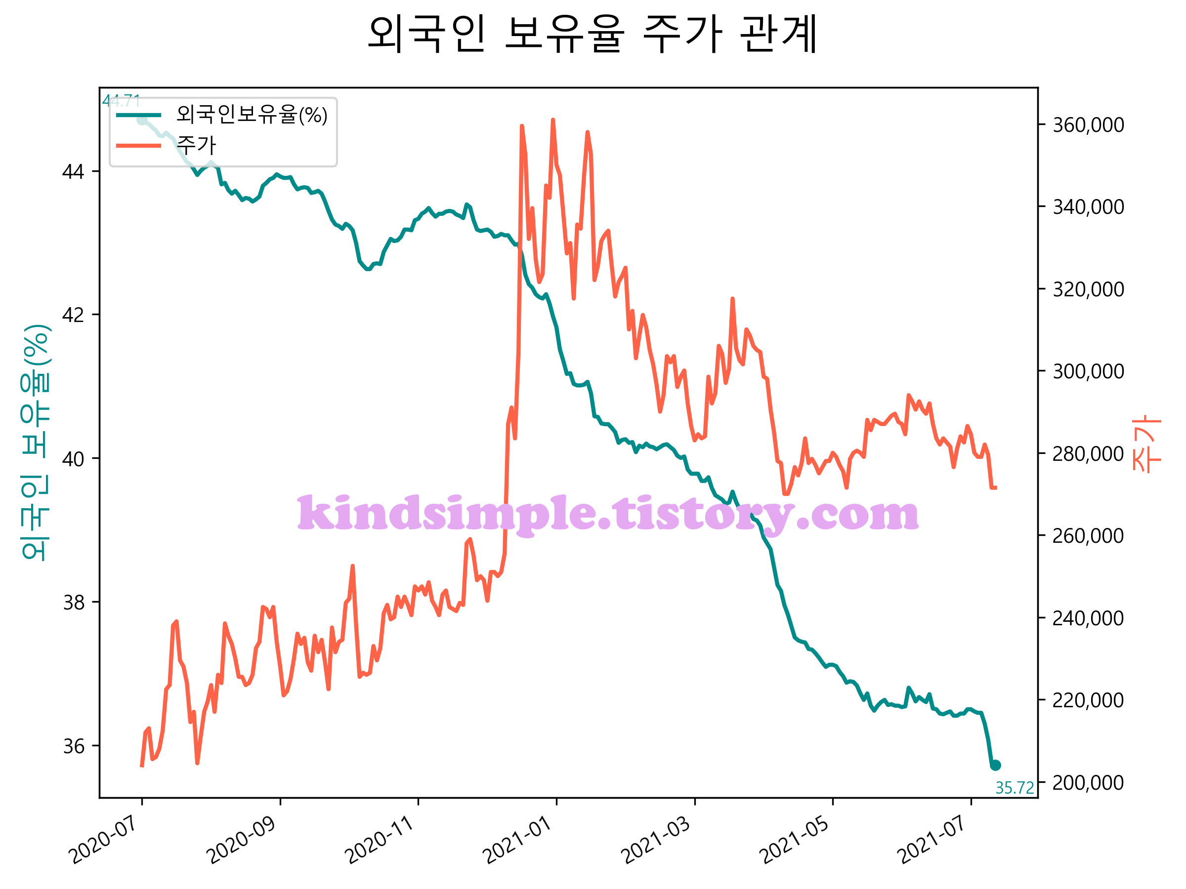 최근 1년간 외국인 보유율 및 주가와의 관계입니다.
