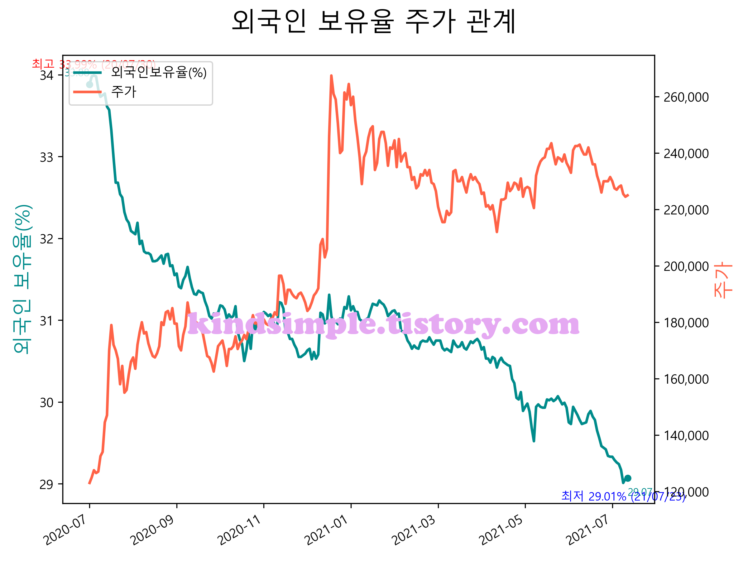 최근 1년간 외국인 보유율 및 주가와의 관계입니다.