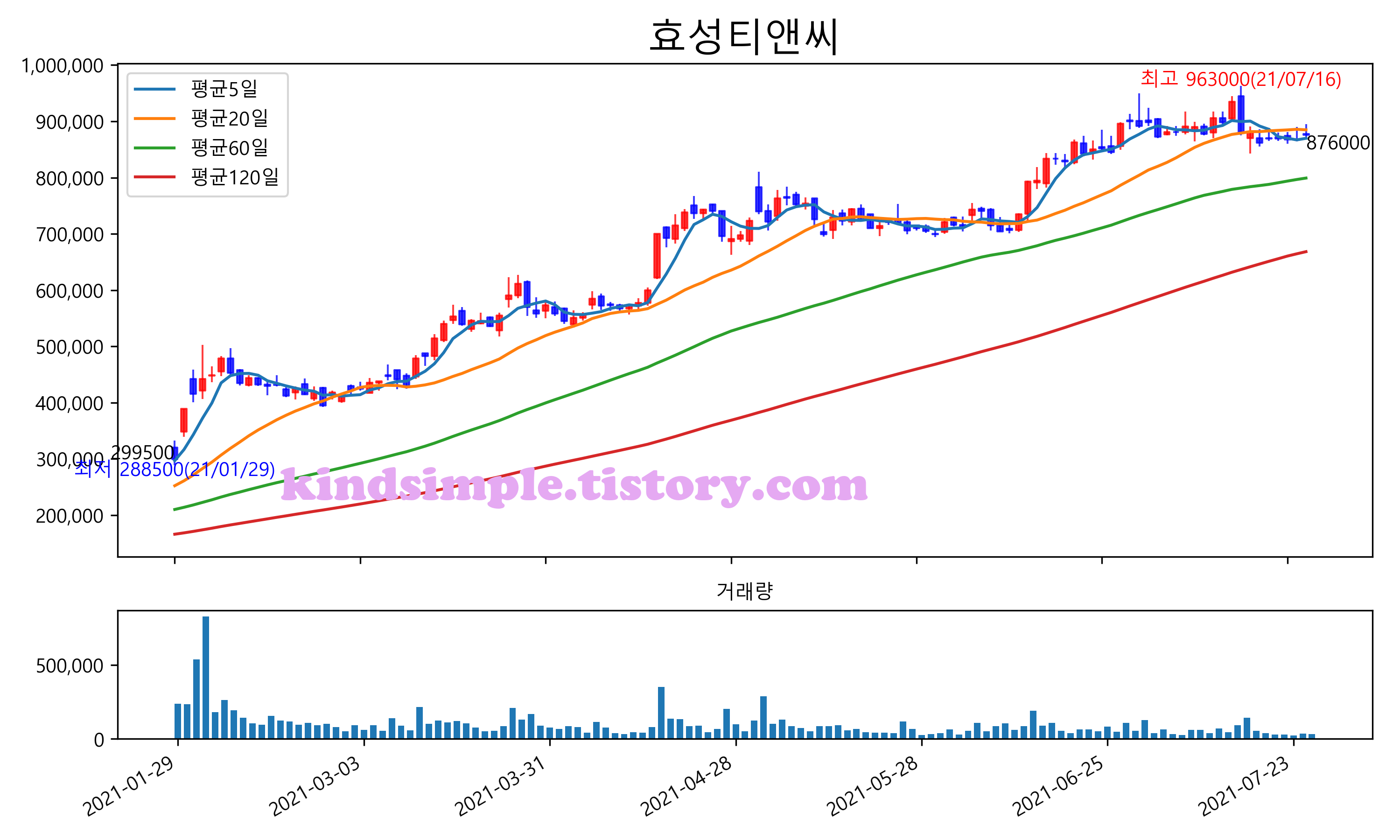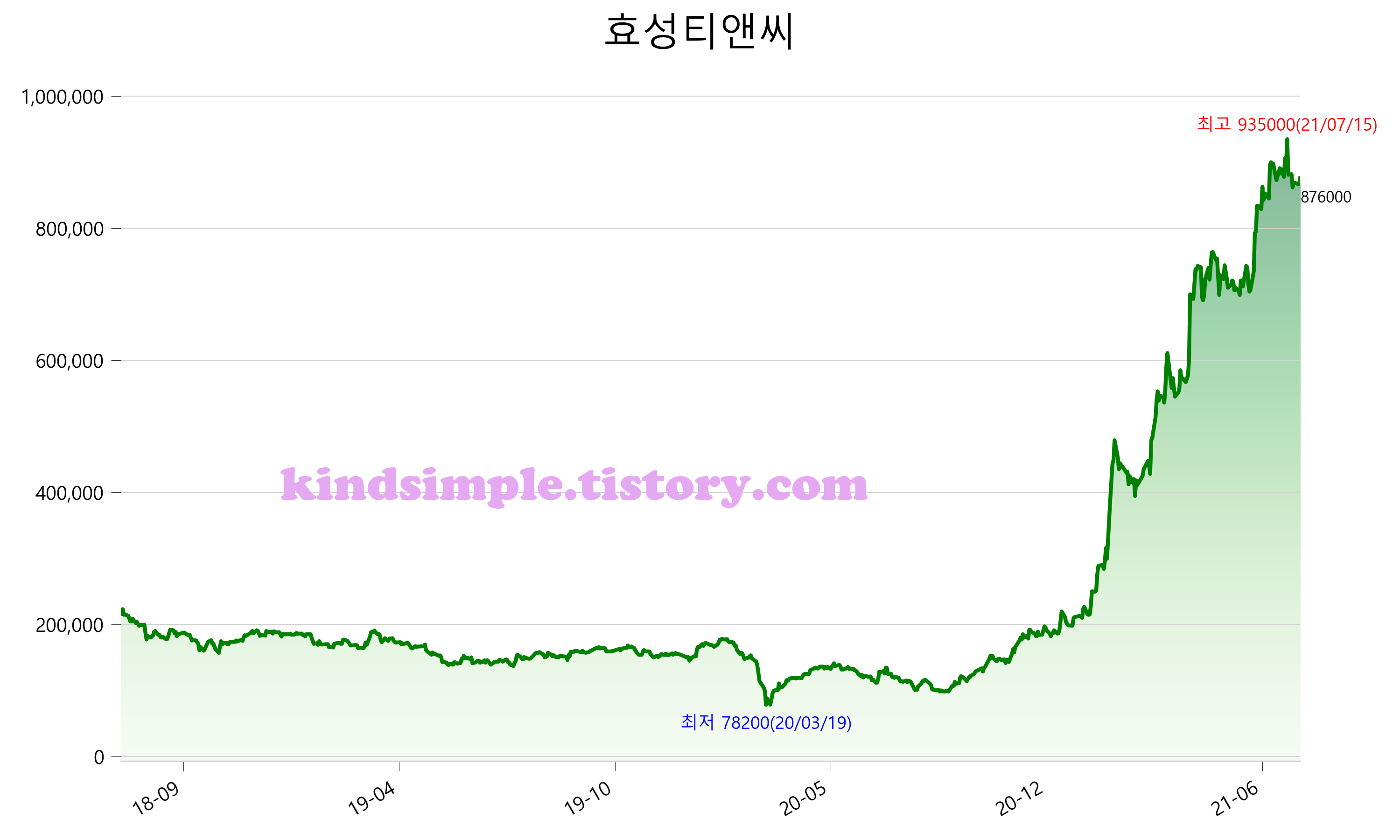 7월 28일 기준 주가는 876,000원 입니다. 아래는 최근 3년간의 주가흐름입니다.