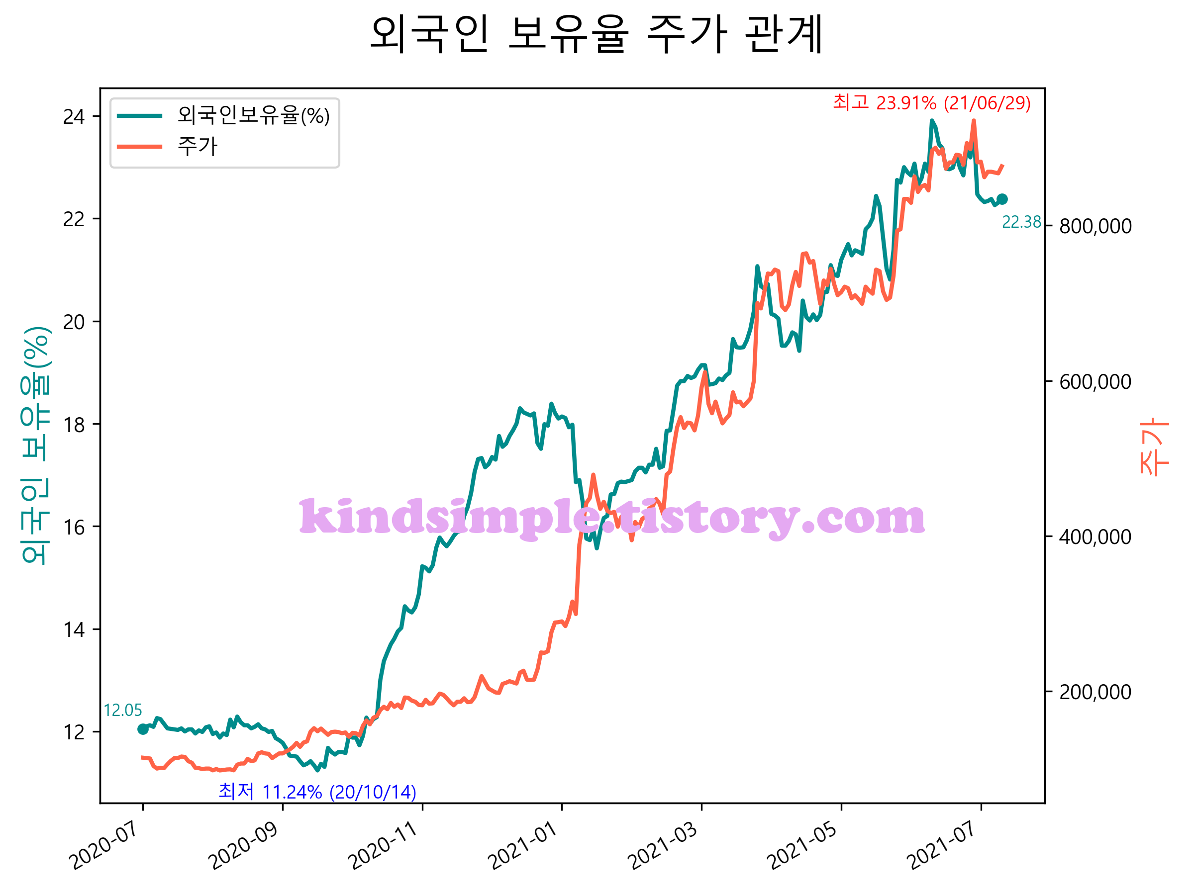 최근 1년간 외국인 보유율 및 주가와의 관계입니다.
