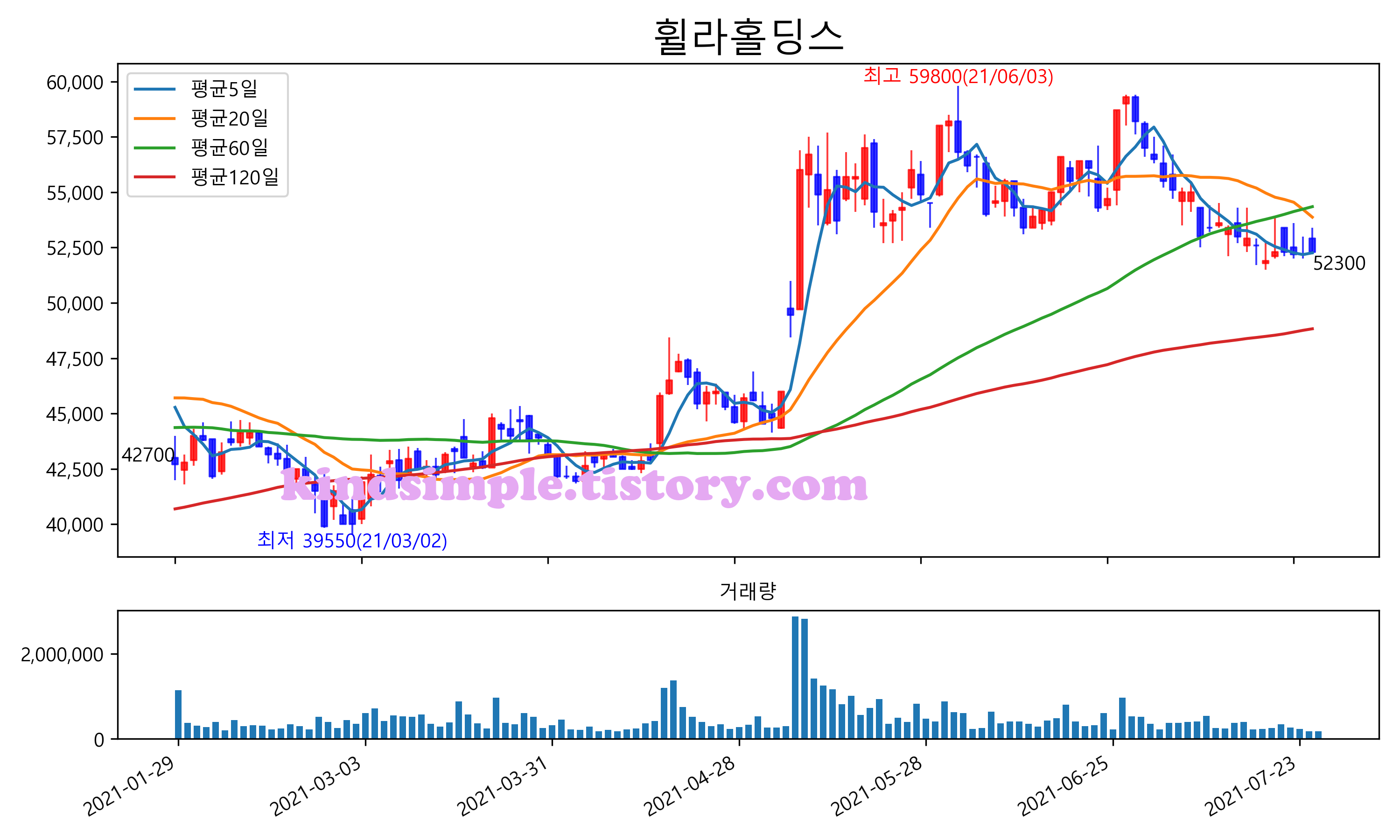 최근 6개월간 캔들차트 및 이동평균선입니다.