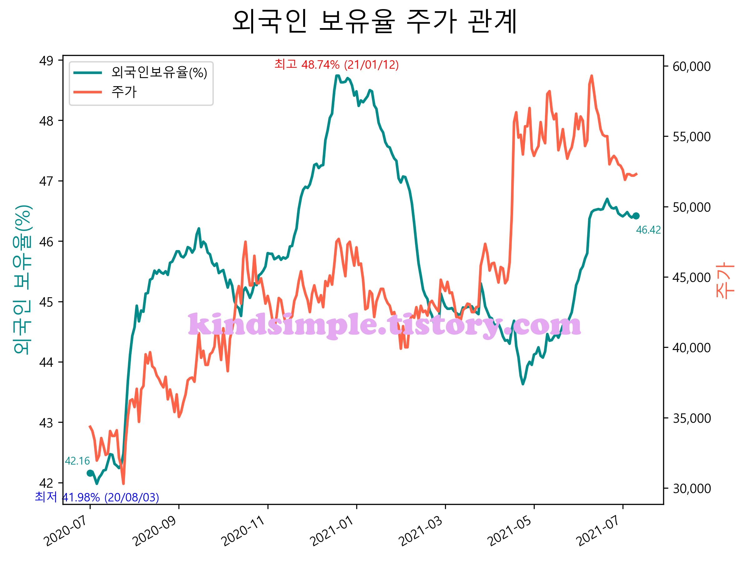 최근 1년간 외국인 보유율 및 주가와의 관계입니다.