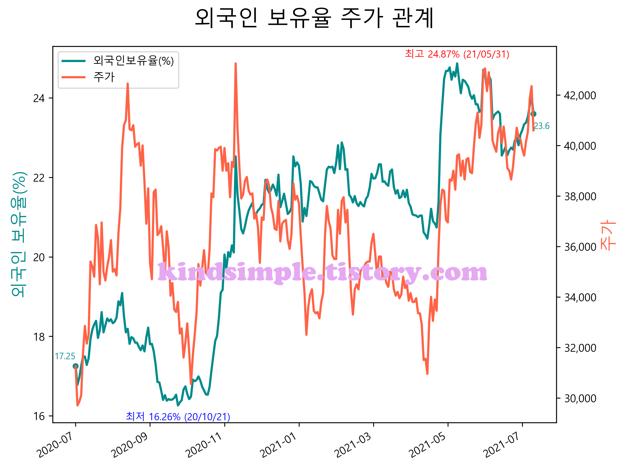 최근 1년간 외국인 보유율 및 주가와의 관계입니다.