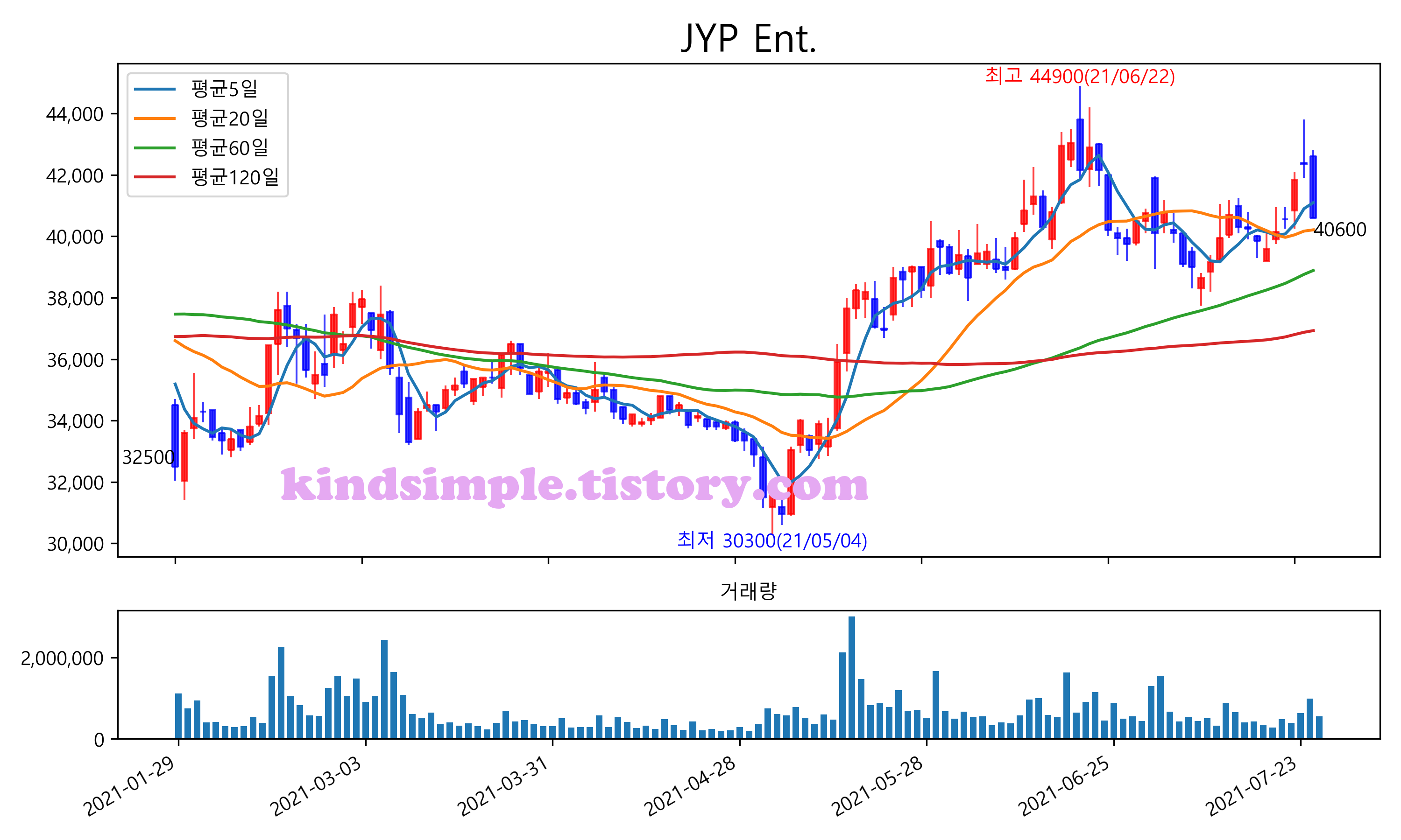 7월 28일 기준 주가는 40,600원 입니다. 아래는 최근 3년간의 주가흐름입니다.