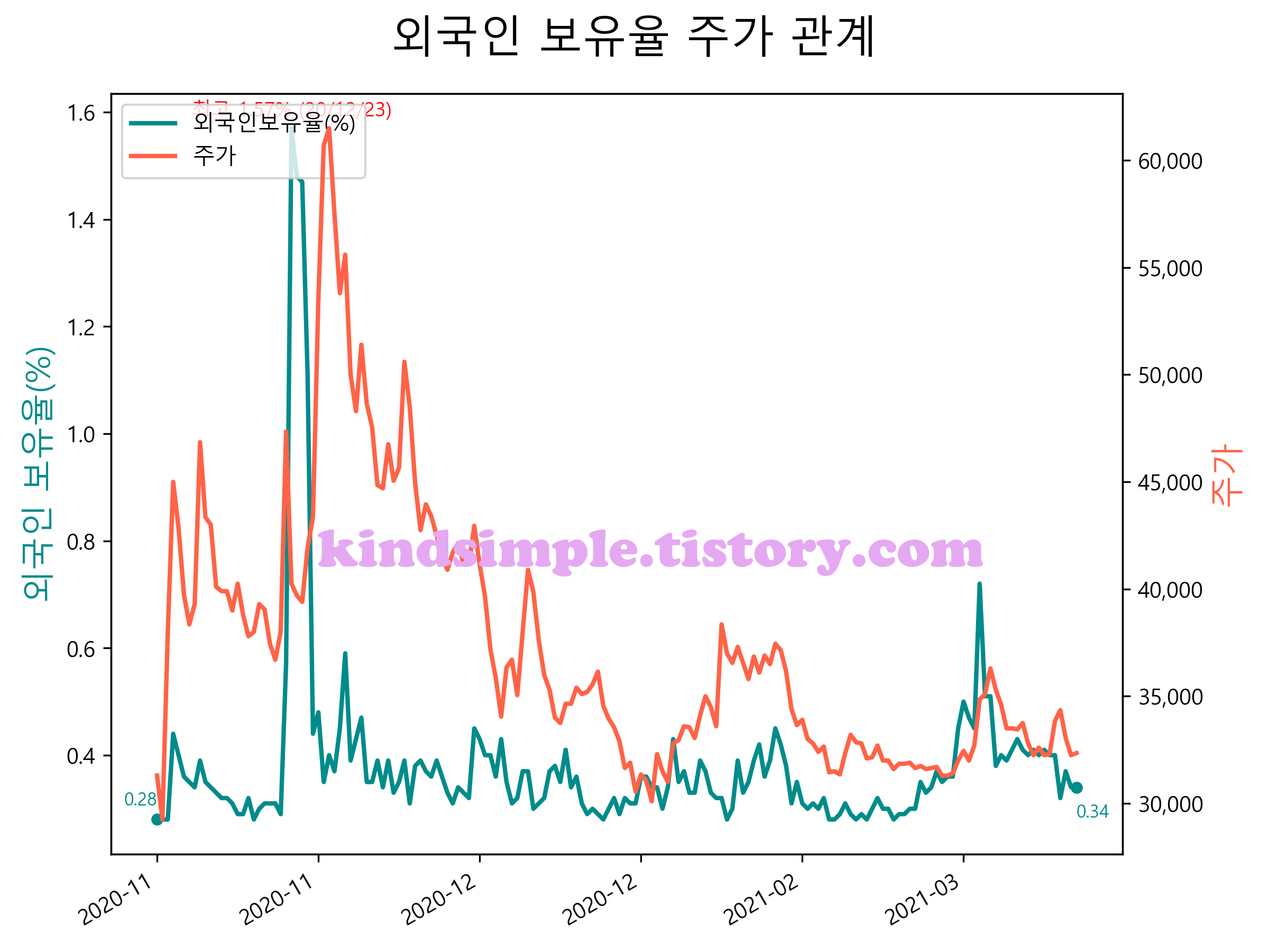 최근 1년간 외국인 보유율 및 주가와의 관계입니다.