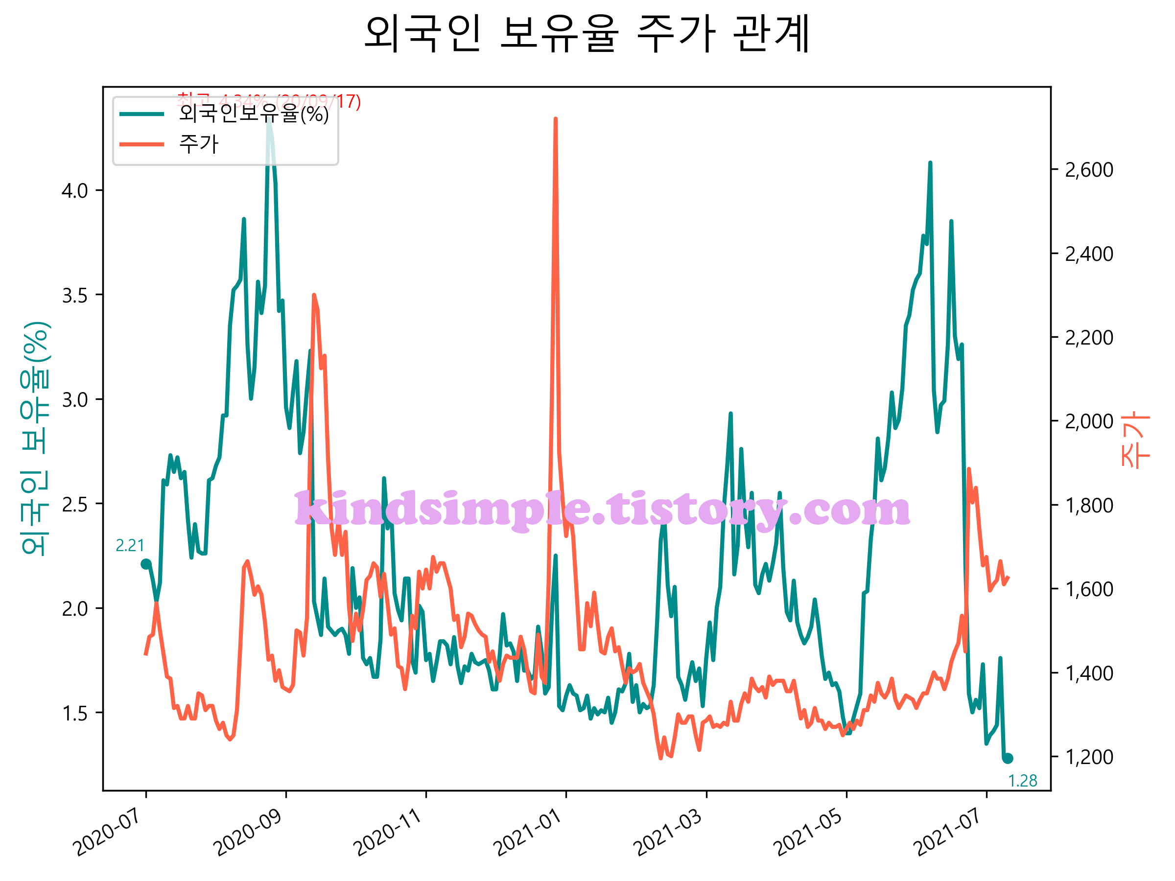 최근 1년간 외국인 보유율 및 주가와의 관계입니다.