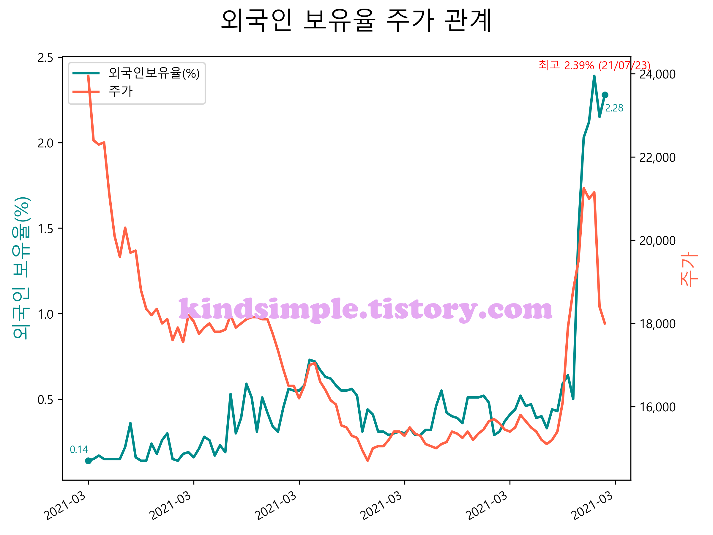 최근 1년간 외국인 보유율 및 주가와의 관계입니다.
