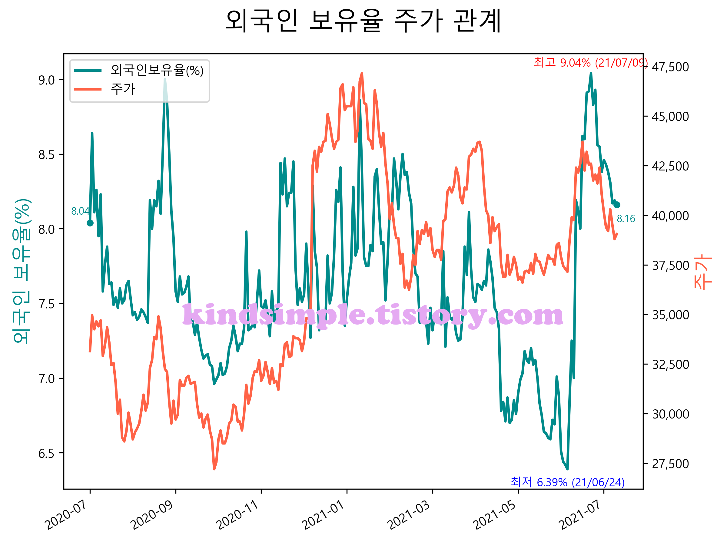 최근 1년간 외국인 보유율 및 주가와의 관계입니다.