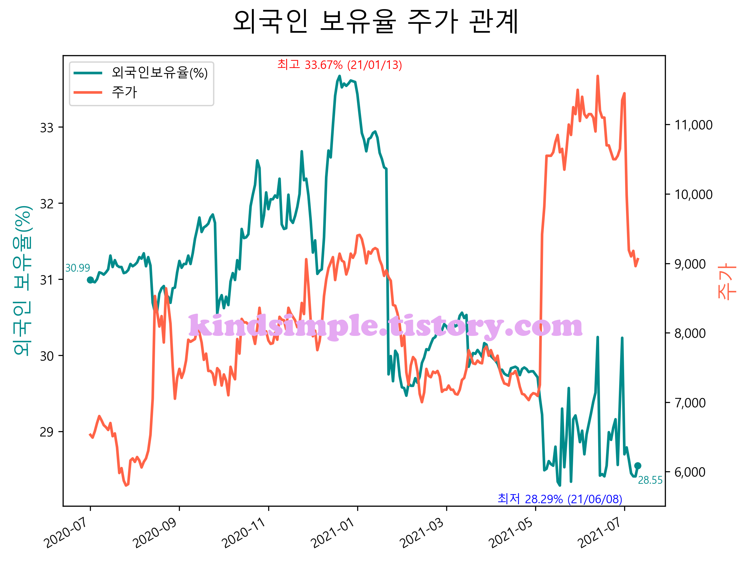 최근 1년간 외국인 보유율 및 주가와의 관계입니다.