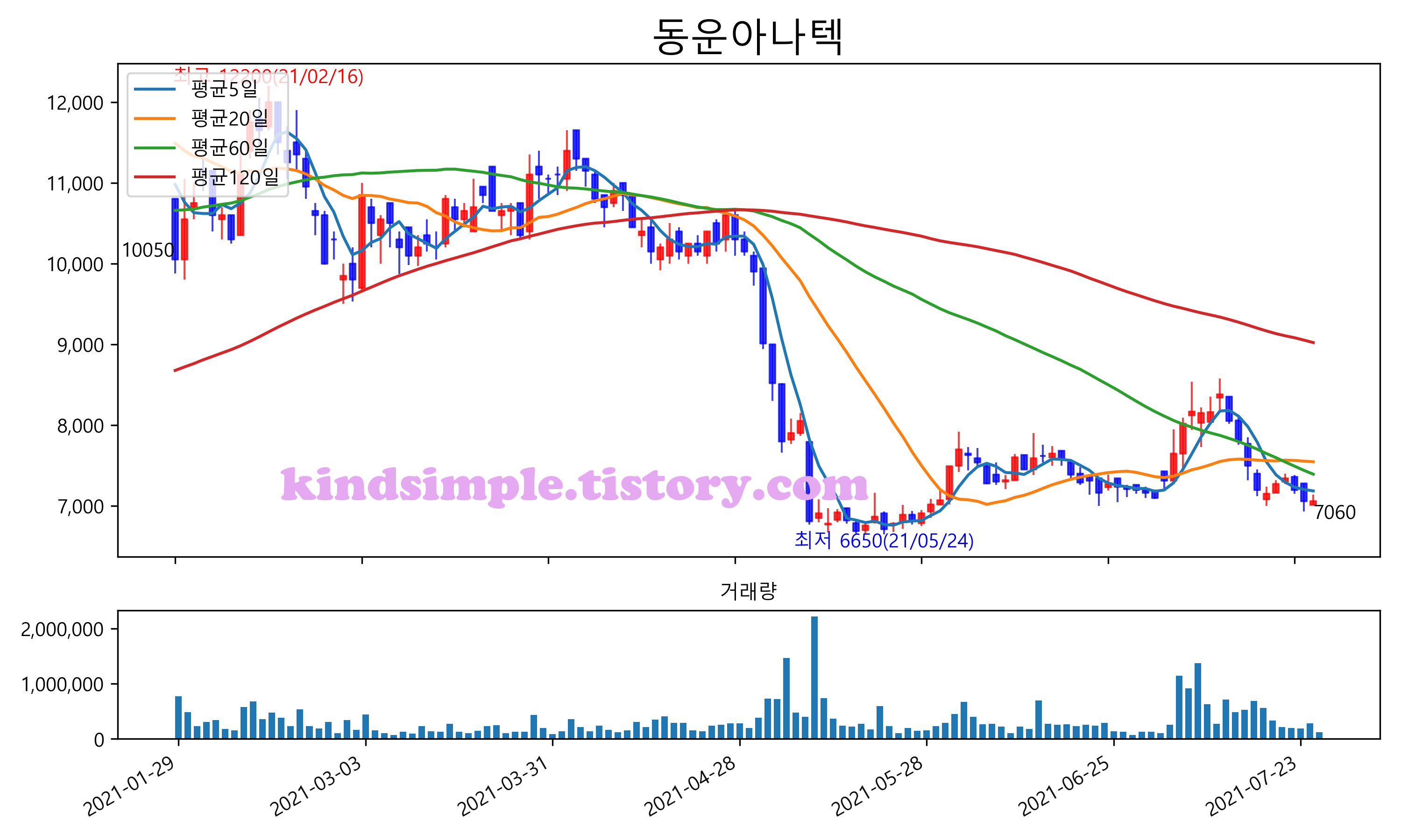 최근 6개월간 캔들차트 및 이동평균선입니다.