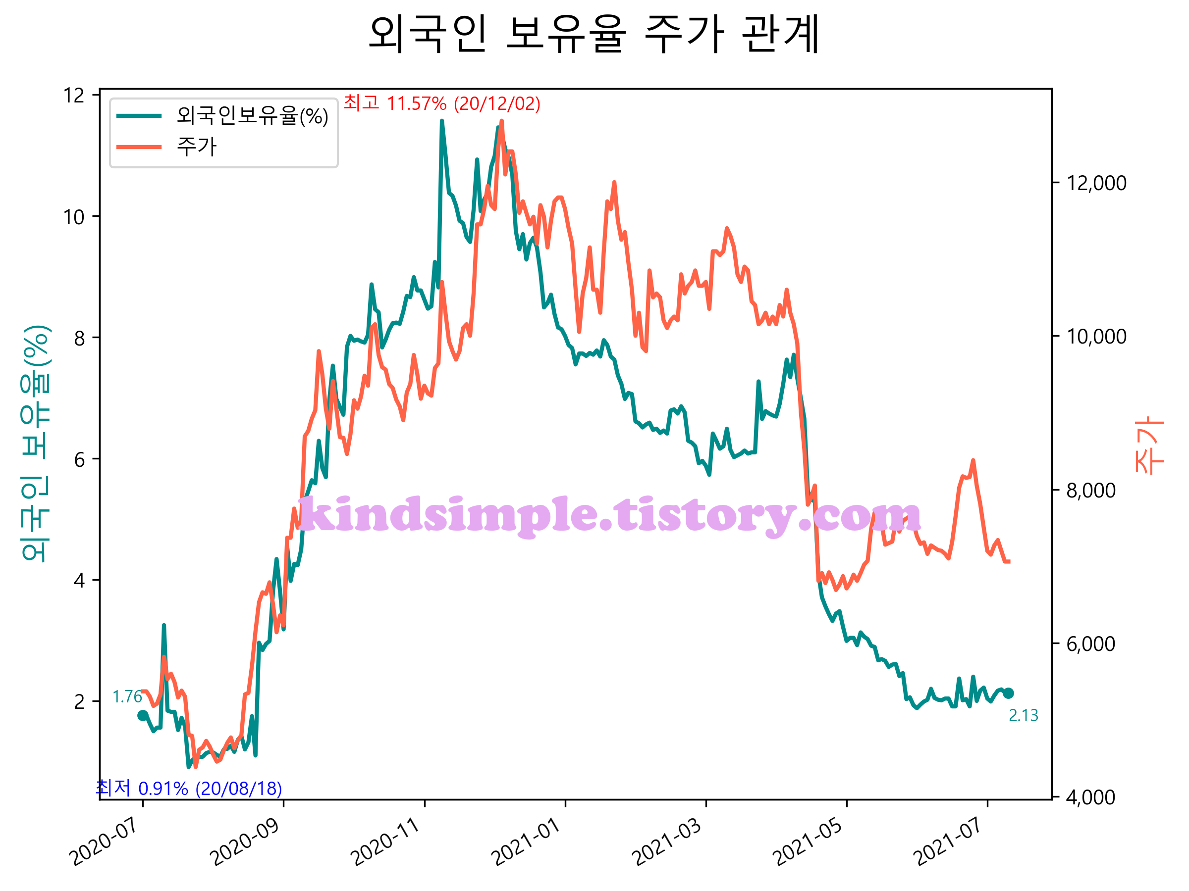 최근 1년간 외국인 보유율 및 주가와의 관계입니다.