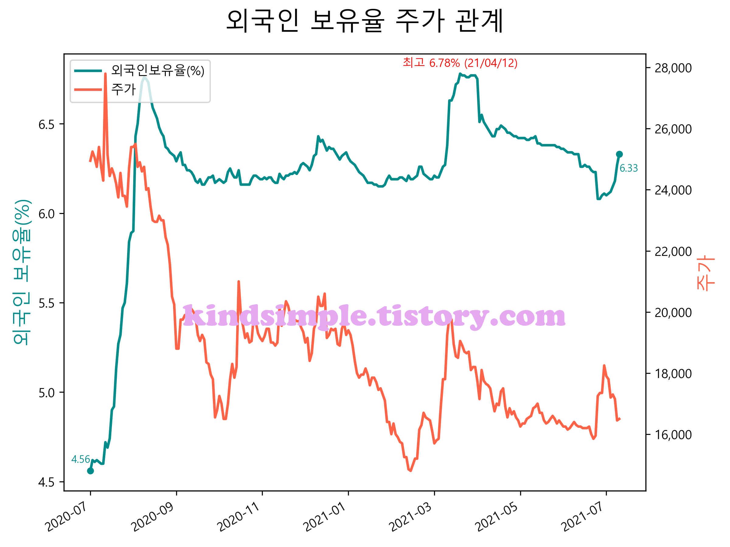 최근 1년간 외국인 보유율 및 주가와의 관계입니다.