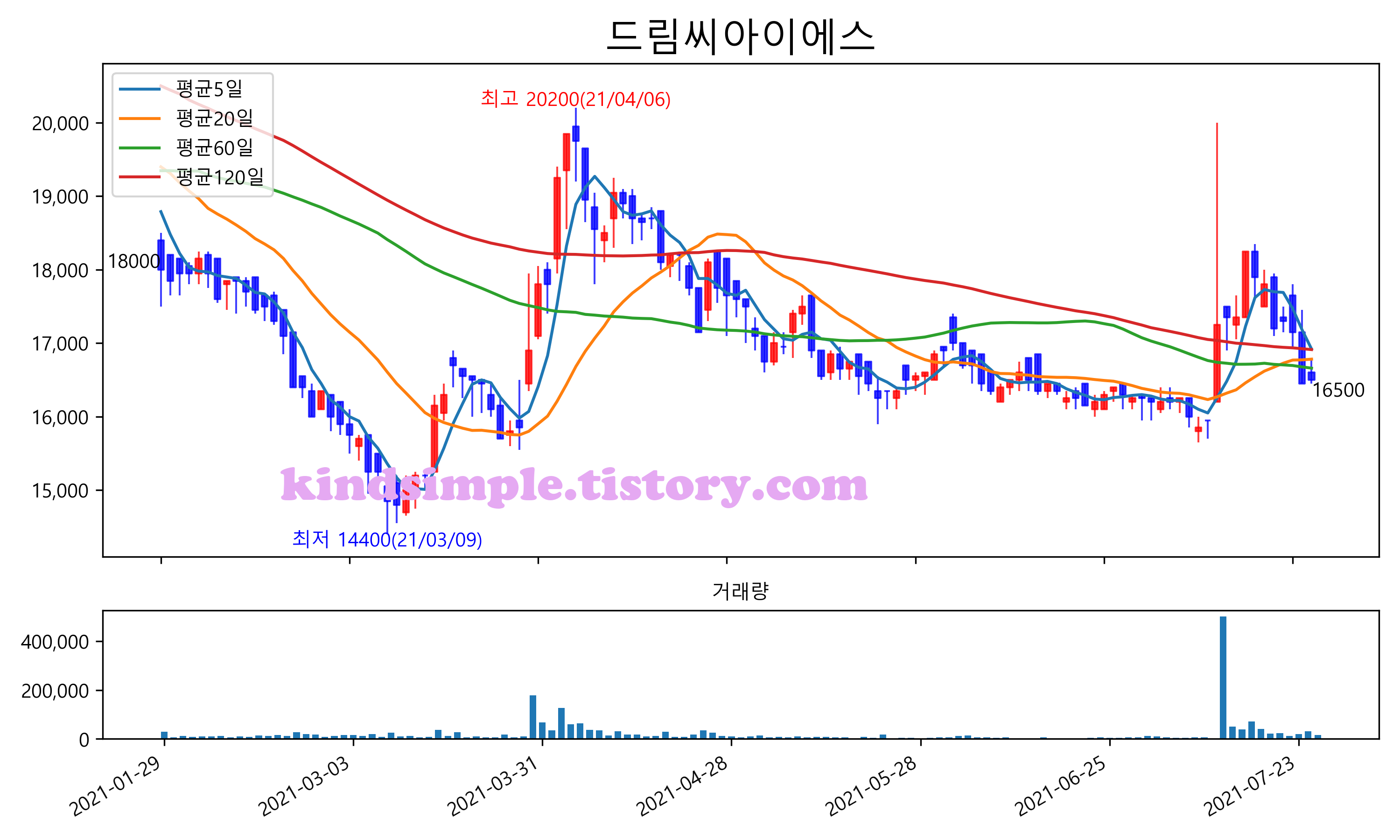 최근 6개월간 캔들차트 및 이동평균선입니다.