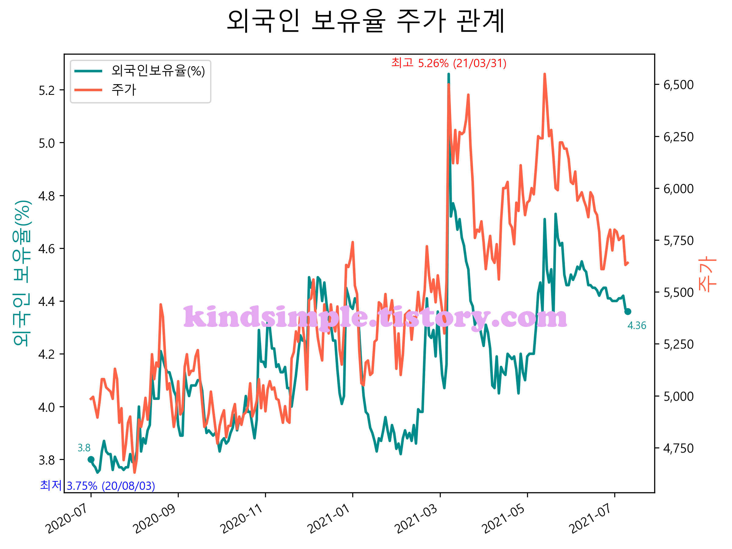 최근 1년간 외국인 보유율 및 주가와의 관계입니다.