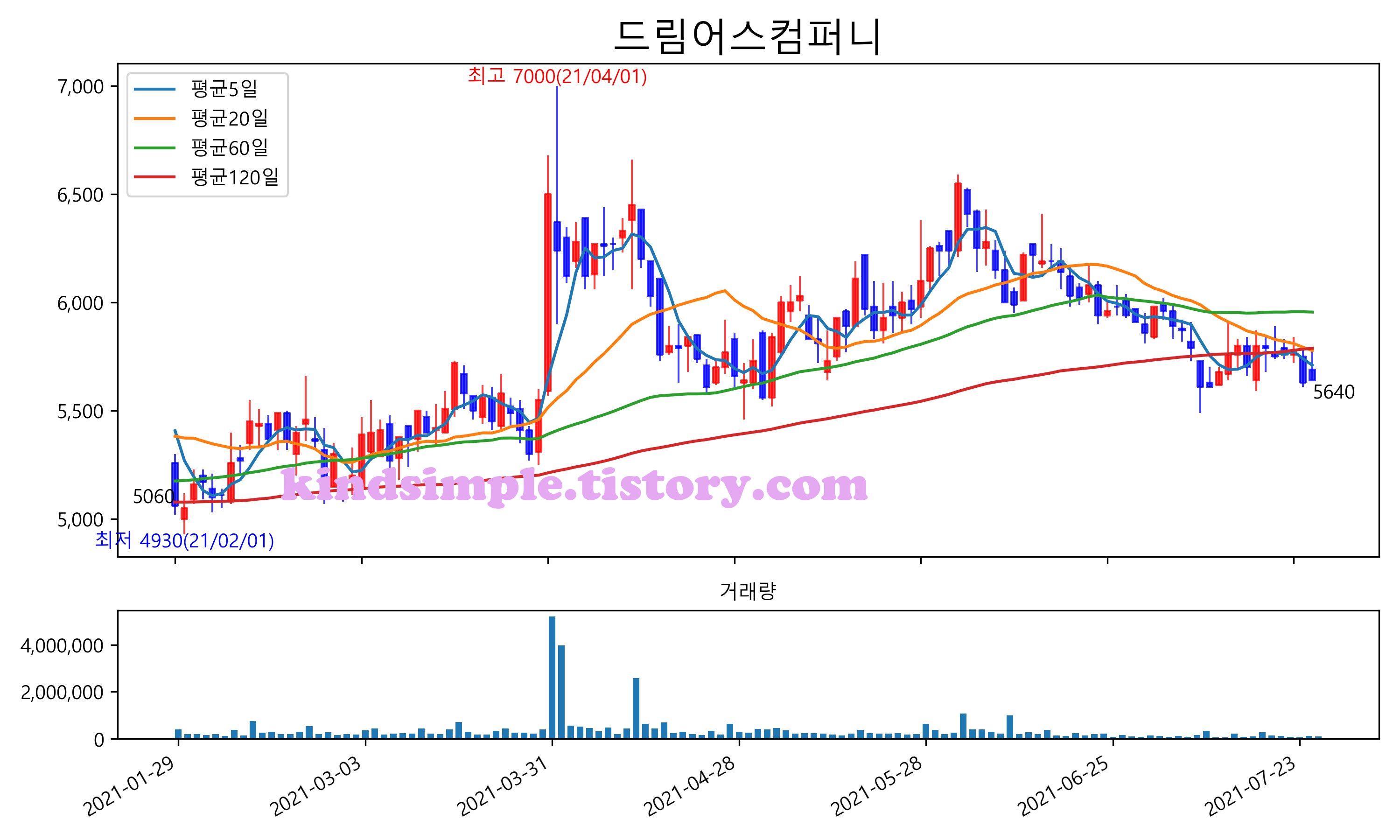 최근 6개월간 캔들차트 및 이동평균선입니다.