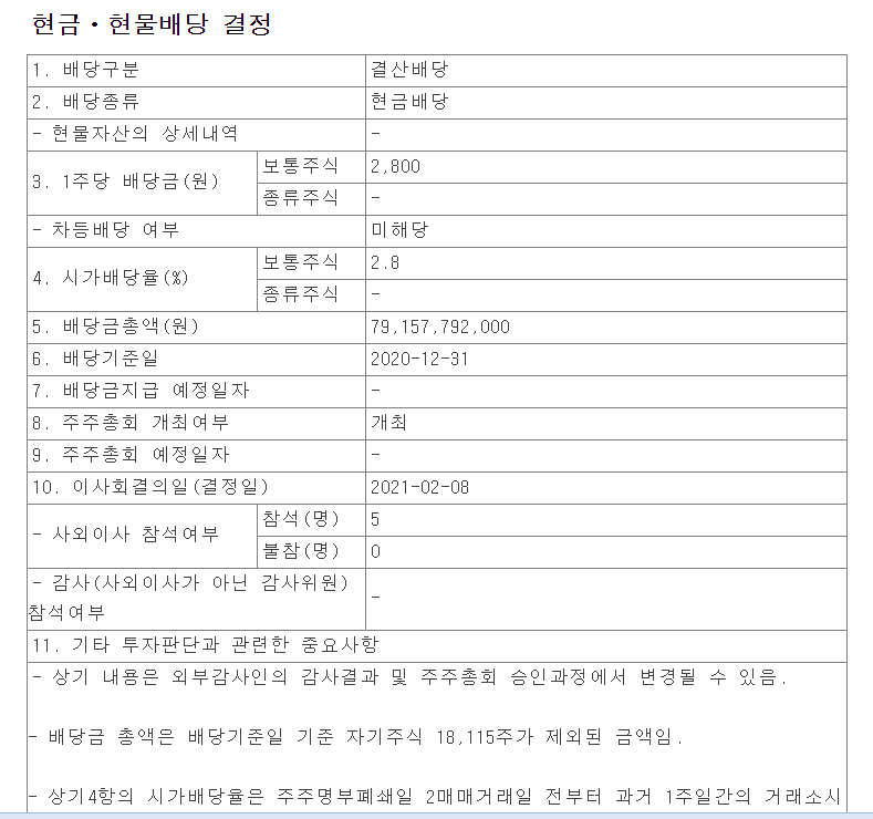2020년 배당금은 주당 2,800원 입니다. 작년 배당금인 3,800원보다 -26.3% 감소했습니다.