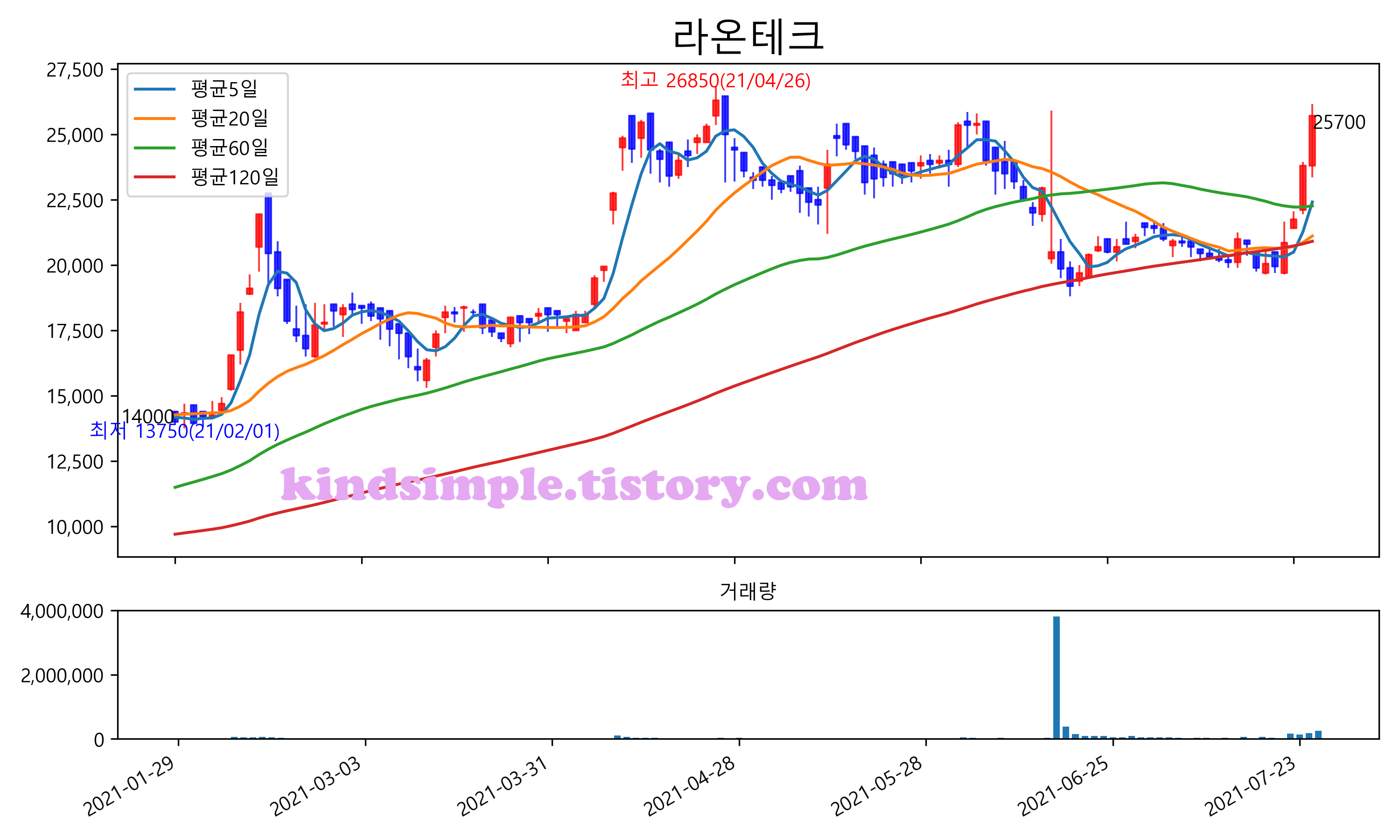 최근 6개월간 캔들차트 및 이동평균선입니다.