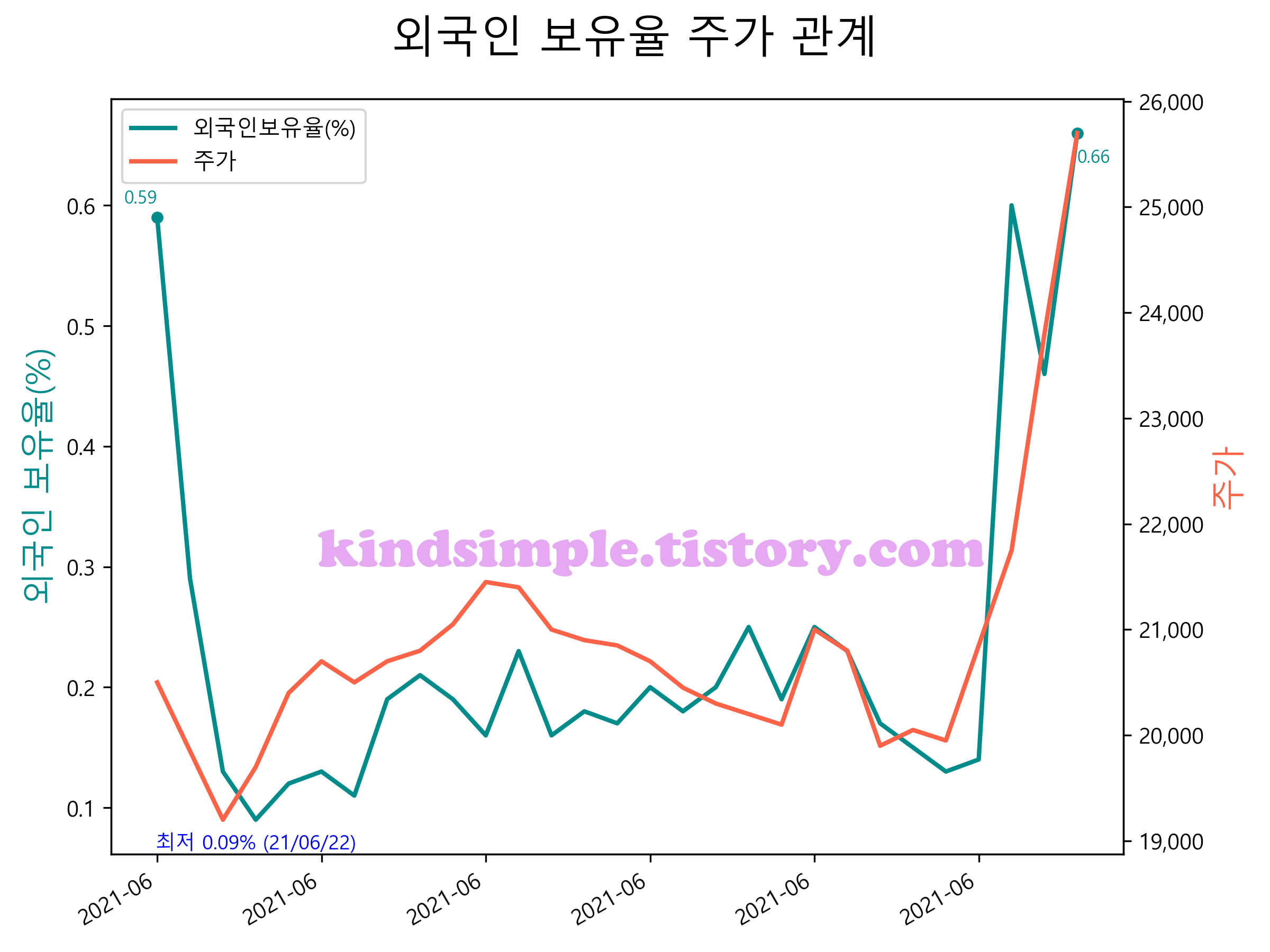 최근 1년간 외국인 보유율 및 주가와의 관계입니다.