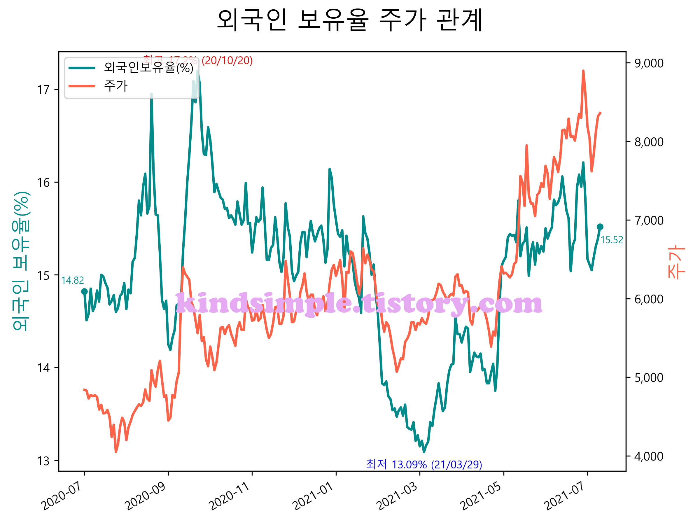 최근 1년간 외국인 보유율 및 주가와의 관계입니다.