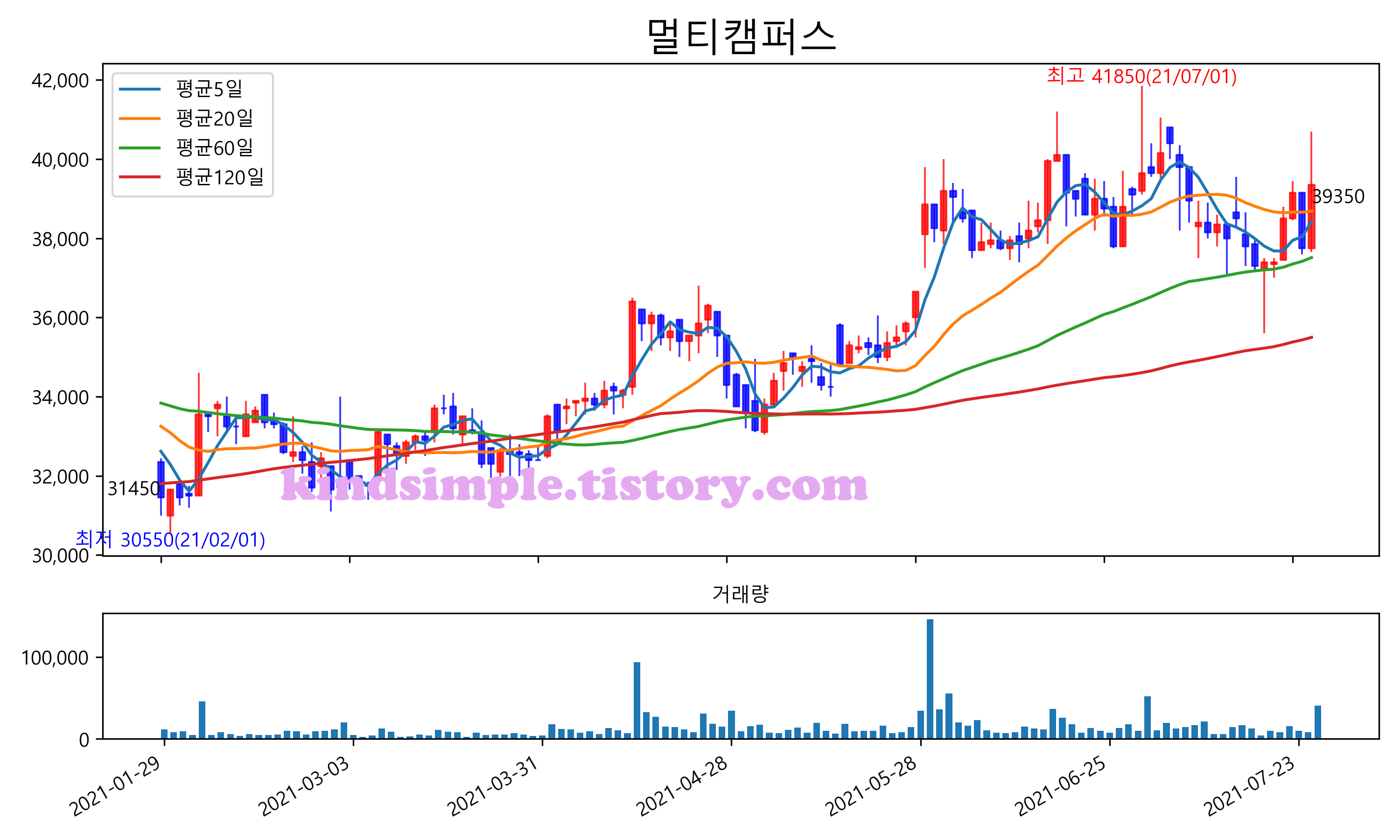 최근 6개월간 캔들차트 및 이동평균선입니다.