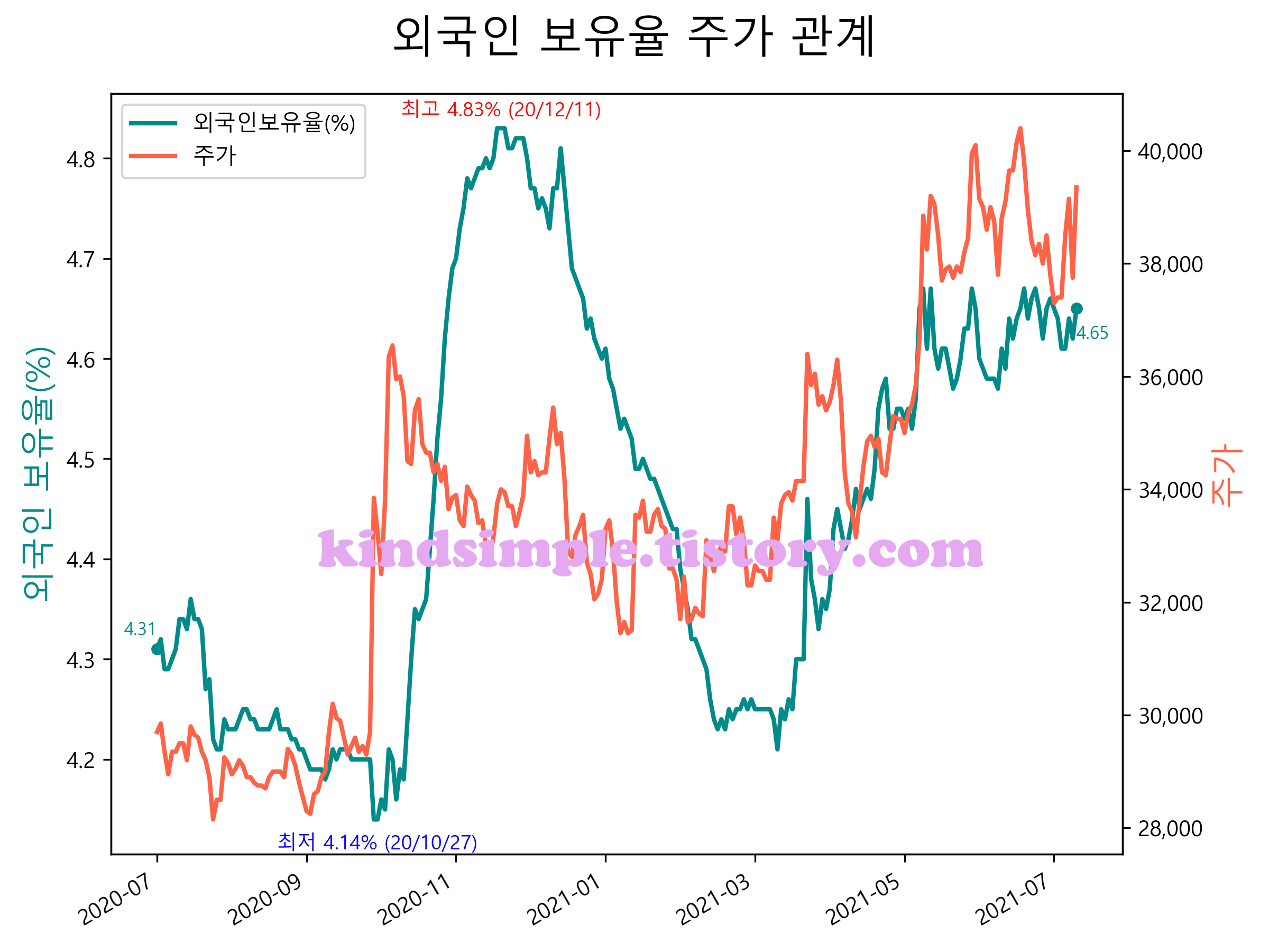 최근 1년간 외국인 보유율 및 주가와의 관계입니다.
