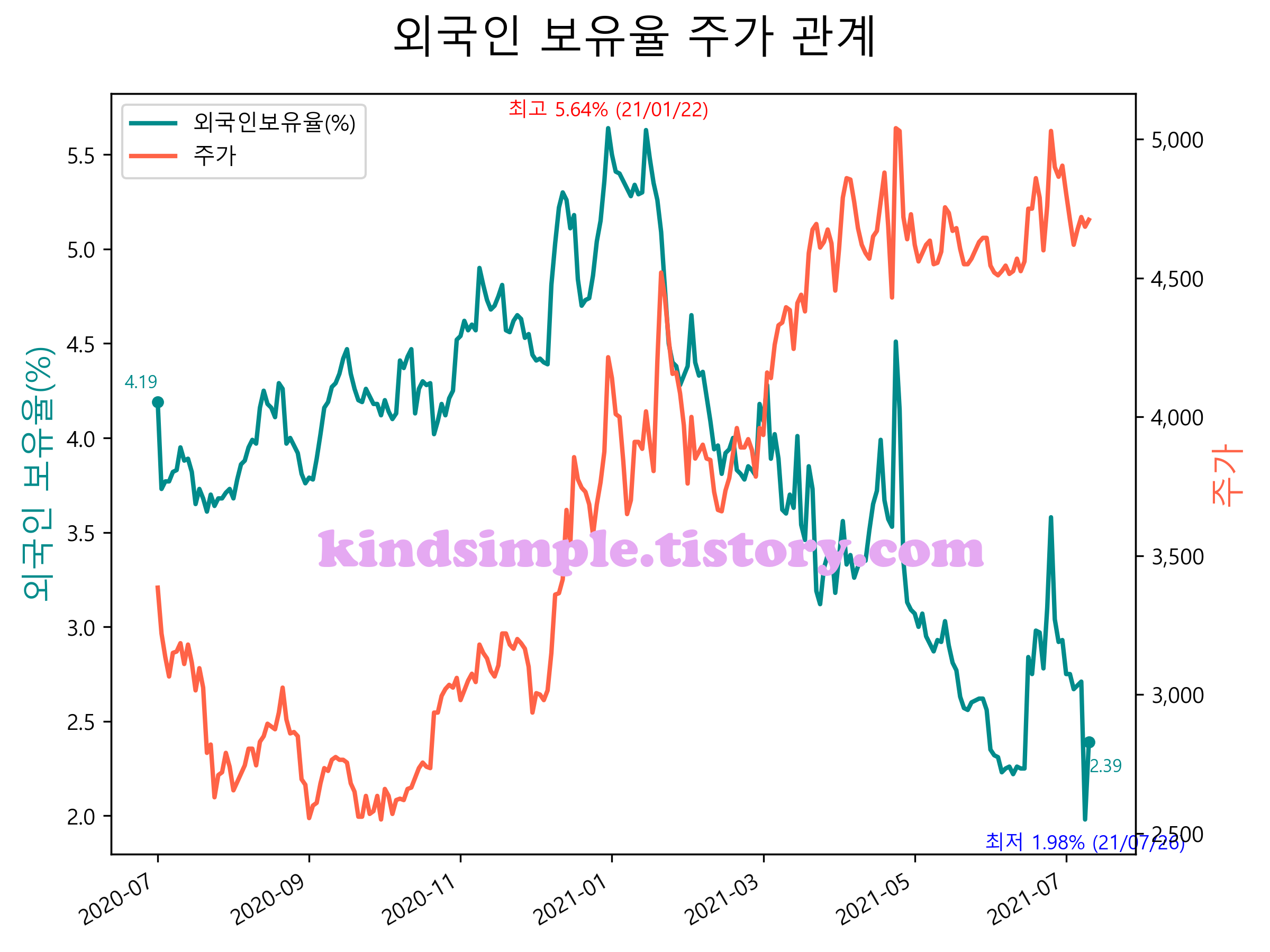 최근 1년간 외국인 보유율 및 주가와의 관계입니다.