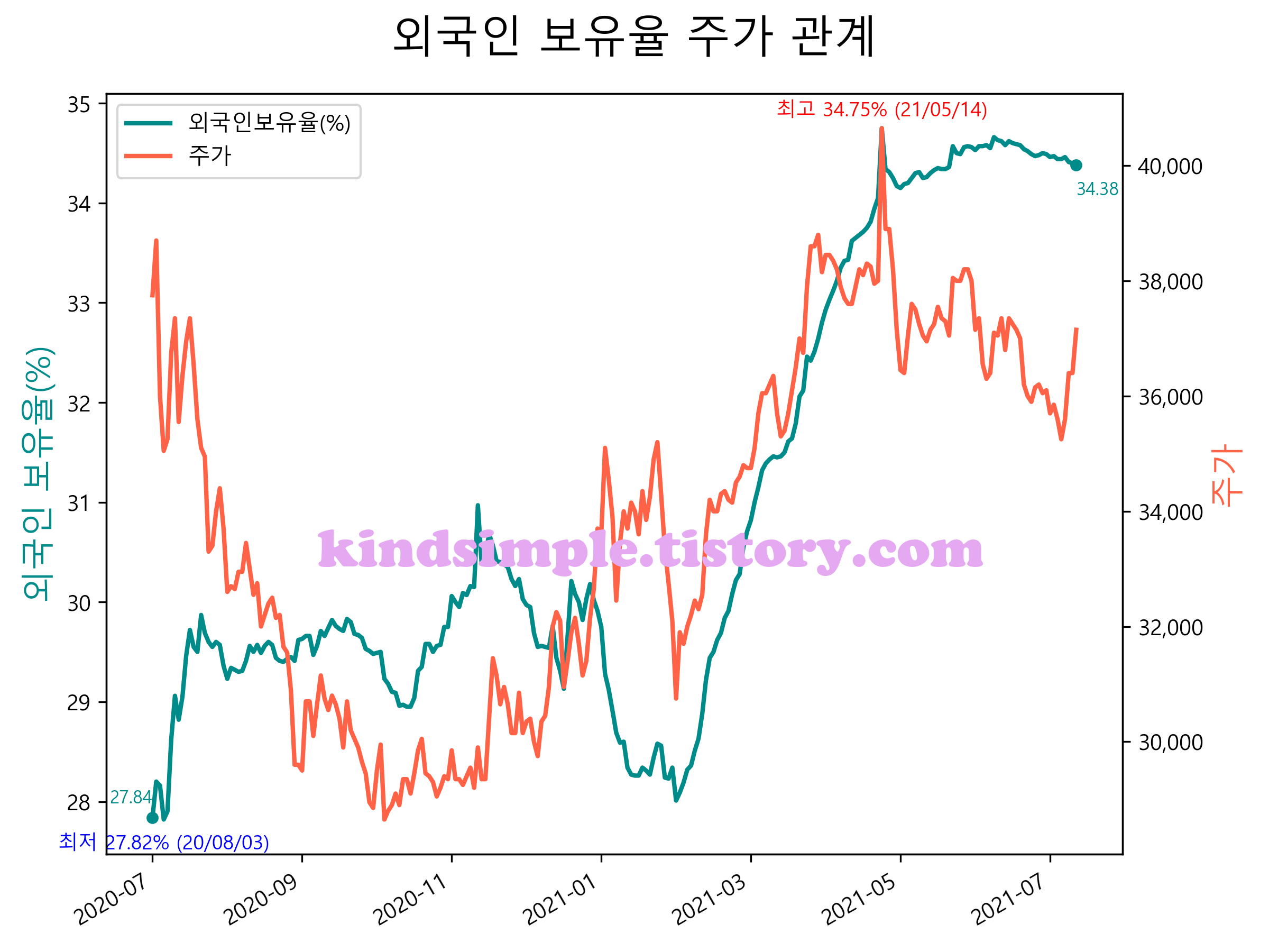 최근 1년간 외국인 보유율 및 주가와의 관계입니다.