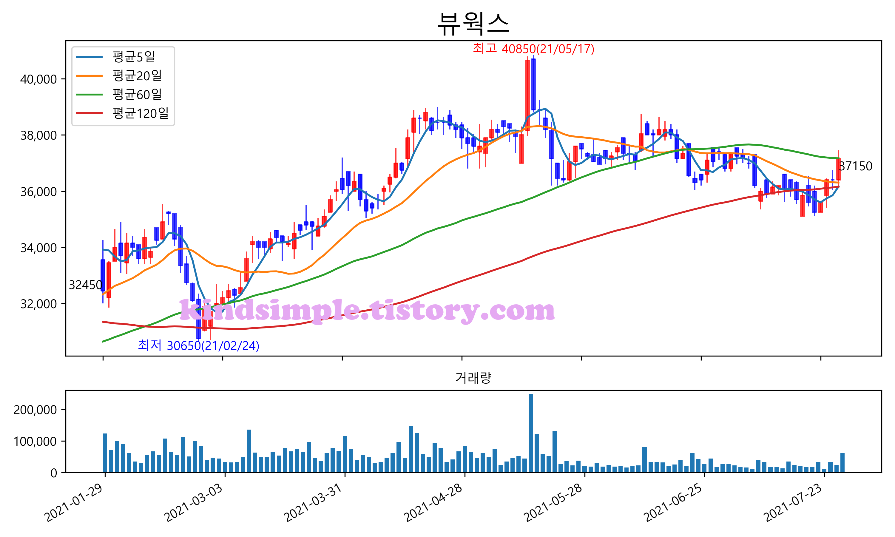 최근 6개월간 캔들차트 및 이동평균선입니다.
